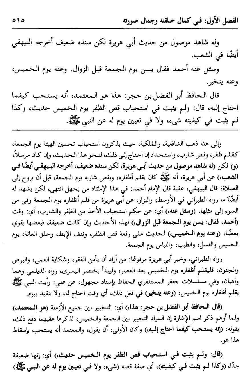 وإلى هذا ذهب الشافعية، والمالكية؛ حيث يذكرون استحباب تحسين الهيئة يوم الجمعة، كقلم ظفر، وقص شارب، واستحدادٍ إن احتاج إلى ذلك، لنحو هذا الحديث، وإن كان مرسلًا، "و" لكن "له شاهد موصول من حديث أبي هريرة؛ لكن سنده ضعيف، أخرجه البيهقي أيضًا في الشعب"، عن أبي هريرة، أنه -صلى الله عليه وسلم- كان يقلّم أظفاره، ويقصّ شاربه يوم الجمعة، قبل أن يروح إلى الصلاة؛ قال البيهقي عقبه: قال الإمام أحمد: في هذا الإسناد من يُجْهَل. انتهى، لكن يشهد له أيضًا ما رواه الطبراني في الأوسط, والبزار، عن أبي هريرة: من قَلَّمَ أظفاره يوم الجمعة وقي من السوء إلى مثلها. "وسُئِلَ عنه"، أي: عن حكم استحباب الأخذ من الظفر والشارب، أي: وقت "أحمد فقال: يسنّ يوم الجمعة قبل الزوال"؛ لهذه الأحاديث وإن كانت ضعيفة، فبعضها يقوي بعضًا، "وعنه يوم الخميس"؛ لحديث علي رفعه: "قصّ الظفر، ونتف الإبط، وحلق العانة يوم الخميس, والغسل والطيب واللباس يوم الجمعة".