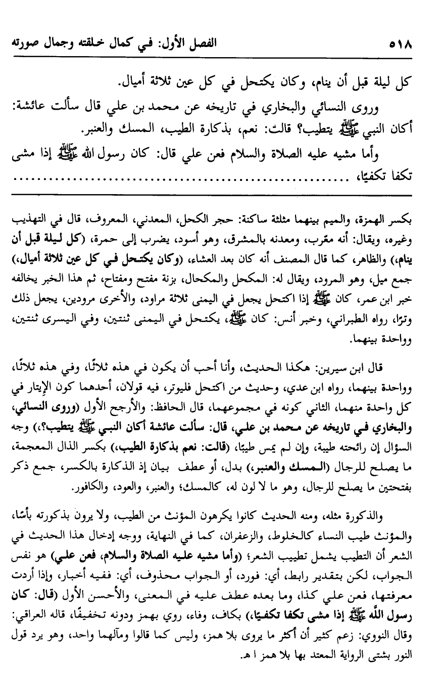 قال ابن سيرين: هكذا الحديث، وأنا أحب أن يكون في هذه ثلاثًا، وفي هذه ثلاثًا، وواحدة بينهما، رواه ابن عدي. وحديث: من اكتحل فليوتر، فيه قولان، أحدهما: كون الإيتار في كل واحدة منهما، الثاني: كونه في مجموعهما، قال الحافظ: والأرجح الأوّل "وروى النسائي، والبخاري في تاريخه, عن محمد بن علي، قال: سألت عائشة: أكان النبي -صلى الله عليه وسلم- يتطيّب"؟ وجه السؤال: إن رائحته طيبة وإن لم يمسّ طيبًا، "قالت: نعم بذكارة الطيب"، بكسر الذال المعجمة- ما يصلح للرجال "المسك والعنبر" بدل، أو عطف بيان؛ إذ الذكارة -بالكسر- جمع ذكر -بفتحتين- ما يصلح للرجال، وهو ما لا لون له، كالمسك والعنبر والعود والكافور.