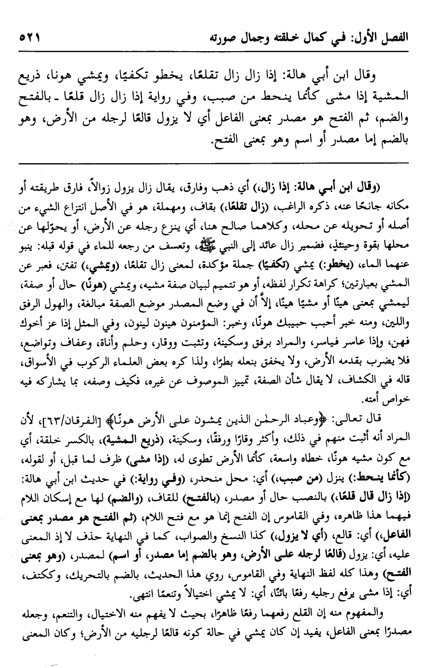 قال تعالى: {وَعِبَادُ الرَّحْمَنِ الَّذِينَ يَمْشُونَ عَلَى الْأَرْضِ هَوْنًا} [الفرقان: 63] ؛ لأنَّ المراد أنه أثبت منهم في ذلك، وأكثر وقارًا ورفقًا، وسكينة، "ذريع المشية" بالكسر- خلقة، أي: مع كون مشيه هونًا خطاه واسعة كأنما الأرض تطوى له، "إذا مشى" ظرف لما قبل، أو لقوله: "كأنما ينحط" ينزل "من صبب"، أي: محل منحدر، "وفي رواية" في حديث ابن أبي هالة: "إذا زال زال قلعًا" بالنصب حال أو مصدر، "بالفتح" للقاف، "والضم" لها مع إسكان اللام فيهما هذا ظاهره، وفي القاموس: إن الفتح إنما هو مع فتح اللام، "ثم الفتح هو مصدر بمعنى الفاعل"، أي: قالع، "أي: لا يزول"، كذا النسخ, والصواب كما في النهاية: حذف لا؛ إذ المعنى عليه، أي: يزول "قالعًا لرجله على الأرض، وهو بالضم إما مصدر، أو اسم" لمصدر، "وهو بمعنى الفتح" وهذا كله لفظ النهاية وفي القاموس، روي هذا الحديث بالضم بالتحريك، وككتف، أي: إذا مشى يرفع رجليه رفعًا بائنًا، أي: لا يمشي اختيالًا وتنعمًا, انتهى.