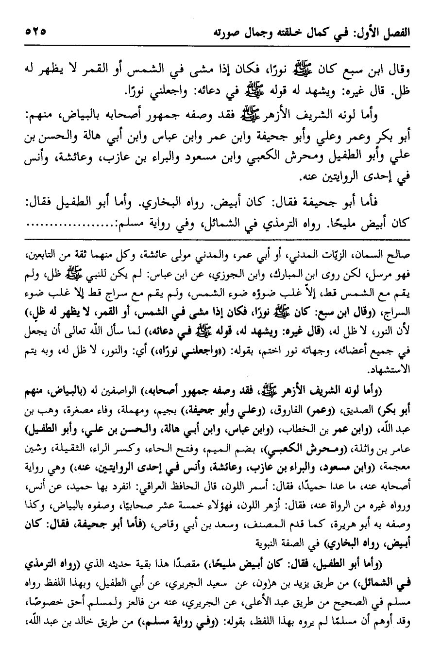 "وأما لونه الشريف الأزهر -صلى الله عليه وسلم، فقد وصفه جمهور أصحابه" الواصفين له "بالبياض، منهم: أبو بكر" الصديق، "وعمر" الفاروق، "وعلي وأبو جحيفة" بجيم، ومهملة، وفاء- مصغرة, وهب بن بد الله، "وابن عمر" بن الخطاب، "وابن عباس، وابن أبي هالة، والحسن بن علي، وأبو الطفيل" عامر بن واثلة، "ومحرش الكعبي" بضم الميم، وفتح الحاء، وكسر الراء، الثقيلة، وشين معجمة، "وابن مسعود، والبراء بن عازب، وعائشة، وأنس في إحدى الروايتين عنه" وهي رواية أصحابه عنه، ما عدا حميدًا فقال: أسمر اللون. قال الحافظ العراقي: انفرد بها حميد عن أنس، ورواه غيره من الرواة عنه، فقال: أزهر اللون، فهؤلاء خمسة عشر صحابيًّا وصفوه بالبياض، وكذا وصفه به أبو هريرة -كما قدَّم المصنف، وسعد بن أبي وقاص، "فأمَّا أبو جحيفة فقال: كان أبيض. رواه البخاري" في الصفة النبوية.