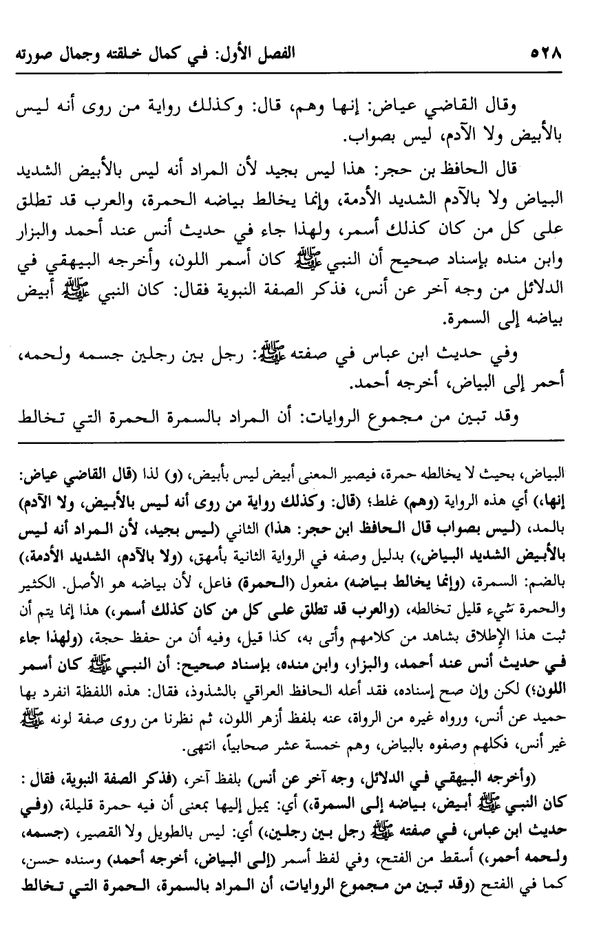 قال الحافظ بن حجر: هذا ليس بجيد؛ لأن المراد أنه ليس بالأبيض الشديد البياض, ولا بالآدم الشديد الأدمة، وإنما يخالط بياضه الحمرة، والعرب قد تطلق على كل من كان كذلك أسمر، ولهذا جاء في حديث أنس عند أحمد والبزار وابن منده بإسناد صحيح, أن النبي -صلى الله عليه وسلم- كان أسمر اللون، وأخرجه البيهقي في الدلائل من وجه آخر عن أنس، فذكر الصفة النبوية فقال: كان النبي -صلى الله عليه وسلم- أبيض بياضه إلى السمرة.