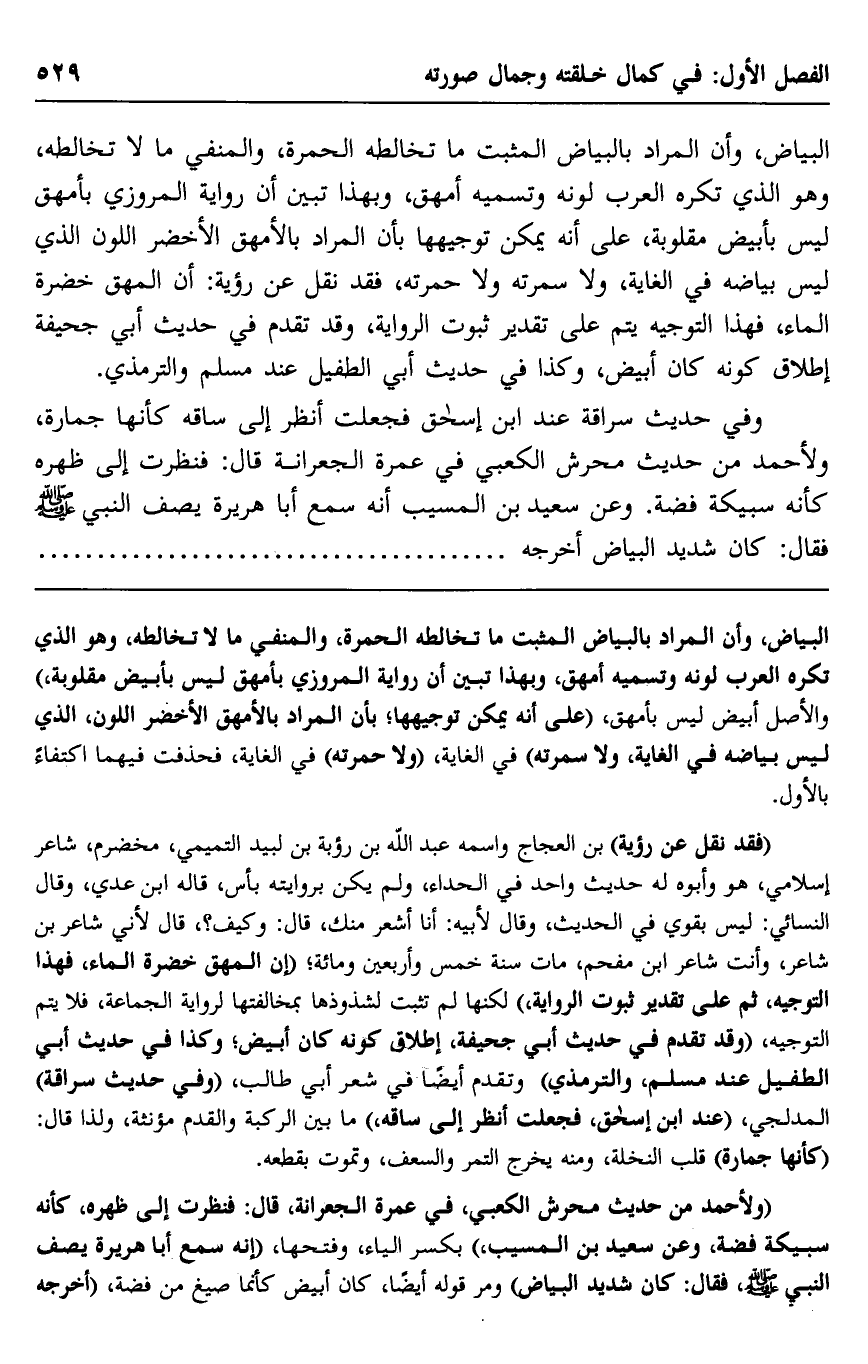 وفي حديث سراقة, عند ابن إسحاق: فجعلت أنظر إلى ساقه كأنها جمارة. ولأحمد من حديث محرش الكعبي في عمرة الجعرانة قال: فنظرت إلى ظهره كأنه سبيكة فضة. وعن سعيد بن المسيب أنه سمع أبا هريرة يصف النبي -صلى الله عليه وسلم- فقال: كان شديد البياض. أخرجه