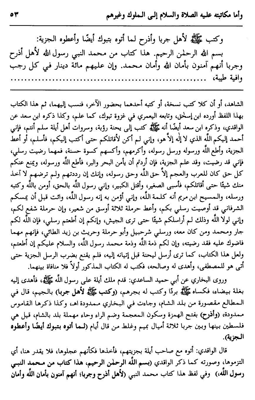 "بسم الله الرحمن الرحيم. هذا كتاب من محمد النبي رسول الله لأهل أذرح وجربا أنهم آمنون بأمان الله وأمان محمد. وإن عليهم مائة دينار في كل رجب وافية طيبة،