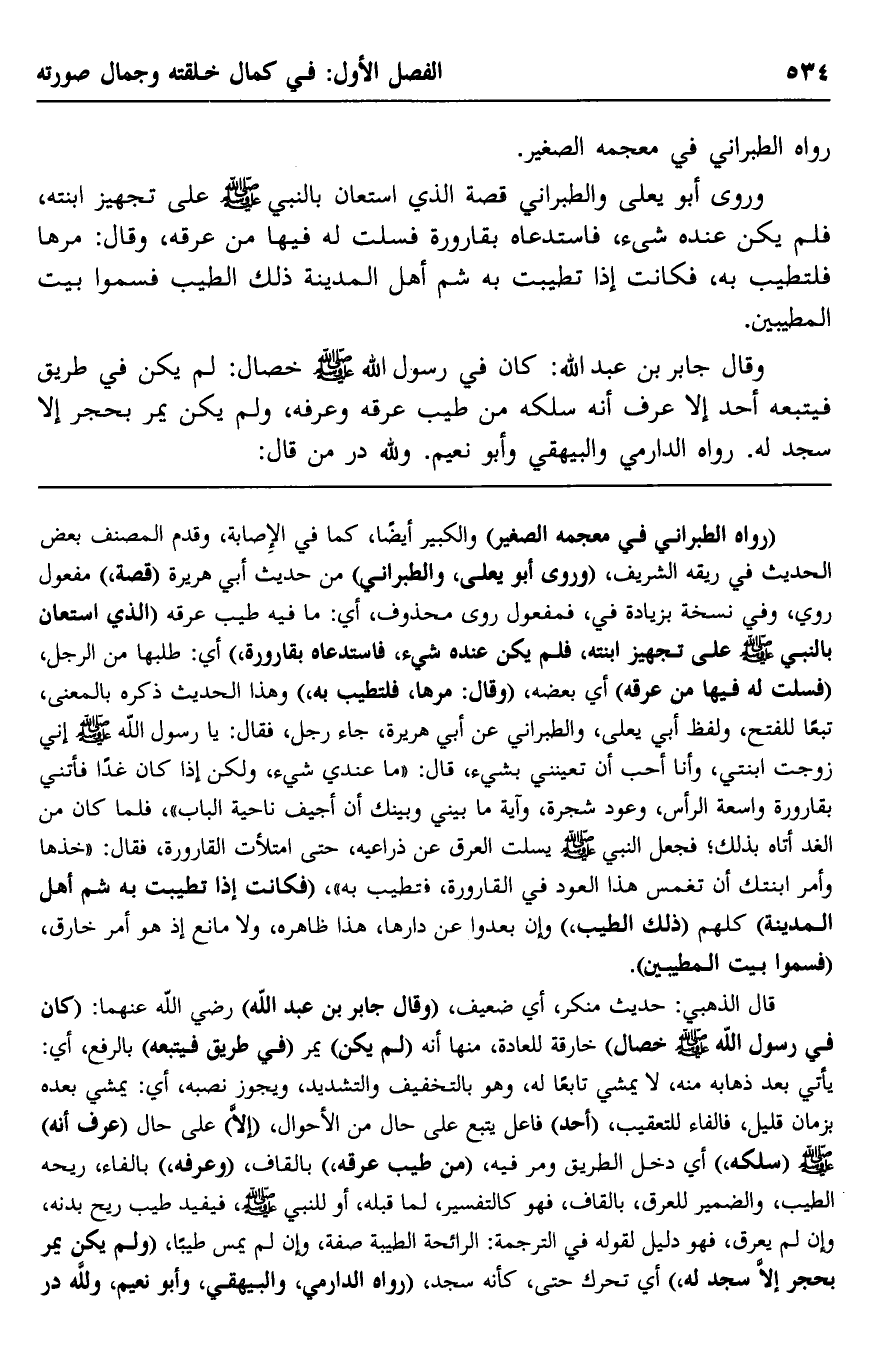 قال الذهبي: حديث منكر، أي: ضعيف، "وقال جابر بن عبد الله" رضي الله عنهما: "كان في رسول الله -صلى الله عليه وسلم- خصال" خارقة للعادة، منها: إنه "لم يكن" يمر "في طريق فيتبعه" بالرفع، أي: يأتي بعد ذهابه منه، لا يمشي تابعًا له، وهو بالتخفيف والتشديد، ويجوز نصبه، أي: يمشي بعده بزمان قليل، فالفاء للتعقيب، "أحد" فاعل يتبع على حال من الأحوال، "إلّا" على حال "عرف أنه" -صلى الله عليه وسلم "سلكه"، أي: دخل الطريق ومَرَّ فيه، "من طيب عرقه" بالقاف، "وعرفه" بالفاء- ريحه الطيب، والضمير للعرق -بالقاف- فهو كالتفسير لما قبله، أو للنبي -صلى الله عليه وسلم، فيفيد طيب ريح بدنه، وإن لم يعرق، فهو دليل لقوله في الترجمة: الرائحة الطيبة صفة، وإن لم يمس طيبًا، "ولم يكن يمر بحجر إلّا سجد له"، أي: تحرك حتى كأنه سجد، "رواه الدارمي والبيهقي وأبو نعيم، ولله در