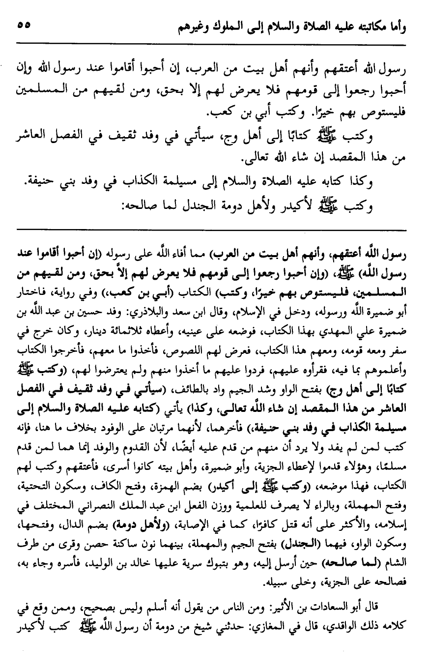 رسول الله أعتقهم، وأنهم أهل بيت من العرب" مما أفاء الله على رسوله "إن أحبوا أقاموا عند رسول الله" صلى الله عليه وسلم، "وإن أحبوا رجعوا إلى قومهم, فلا يعرض لهم إلا بحق، ومن لقيهم من المسلمين فليستوص بهم خيرًا"، وكتب" الكتاب "أُبَيّ بن كعب"، وفي رواية: فاختار أبو ضمرة الله ورسوله، ودخل في الإسلام، وقال ابن سعيد والبلاذري: وفد حسين بن عبد الله بن ضميرة على المهدي بهذا الكتاب، فوضعه على عينيه، وأعطاه ثلاثمائة دينار، وكان خرج في سفر ومعه قومه، ومعهم هذا الكتاب، فعرض لهم اللصوص، فأخذوا ما معهم، فأخرجوا الكتاب وأعلموهم بما فيه، فقرأوه عليهم، فردوا عليهم ما أخذوا منهم ولم يعترضوا لهم، "وكتب -صلى الله عليه وسلم- كتابًا إلى أهل وج" بفتح الواو وشد الجيم- وادٍ بالطائف "سيأتي في وفد ثقيف في الفصل العاشر من هذا المقصد إن شاء الله تعالى، وكذا" يأتي "كتابه -عليه الصلاة والسلام- إلى مسيلمة الكذاب في وفد بني حنيفة"، فأخرهما؛ لأنهما مرتَّان على الوفود بخلاف ما هنا، فإنه كتب لمن لم يفد, ولا يرد أن منهم من قدم عليه أيضًا؛ لأن القدوم والوفد إنما هما لمن قدم مسلمًا، وهؤلاء قدموا لإعطاء الجزية، وأبو ضميرة وأهل بيته كانوا أسرى, فأعتقهم وكتب لهم الكتاب، فهذا موضعه، "وكتب -صلى الله عليه وسلم- إلى أكيدر" بضم الهمزة، وفتح الكاف، وسكون التحتية، وفتح المهملة، وبالراء, لا يصرف للعلمية ووزن الفعل, ابن عبد الملك, النصراني المختلف في إسلامه، والأكثر على أنه قتل كافرًا، كما في الإصابة، "ولأهل دومة" بضم الدال، وفتحها، وسكون الواو فيهما, "الجندل" بفتح الجيم والمهملة، بينهما نون ساكنة, حصن وقرى من طرف الشام "لمن صالحه" حين أرسل إليه، وهو بتبوك, سرية عليها خالد بن الوليد، فأسره وجاء به، فصالحه على الجزية، وخلَّى سبيله.
