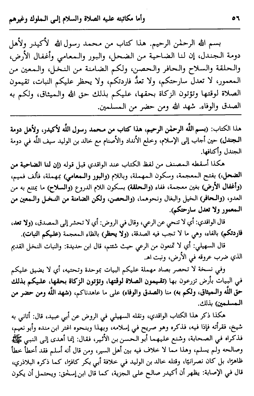 "بسم الله الرحمن الرحيم. هذا كتاب من محمد رسول الله لأكيدر ولأهل دومة الجندل، إن لنا الضاحية من الضحل، والبور والمعامي وأغفال الأرض، والحلقة والسلاح والحافر والحصن، ولكم الضامنة من النخل، والمعين من المعمور، لا تعدل سارحتكم، ولا تعد فاردتكم، ولا يحظر عليكم النبات، تقيمون الصلاة لوقتها وتؤتون الزكاة بحقها، عليكم بذلك حق الله والميثاق، ولكم به الصدق والوفاء. شهد الله ومن حضر من المسلمين".