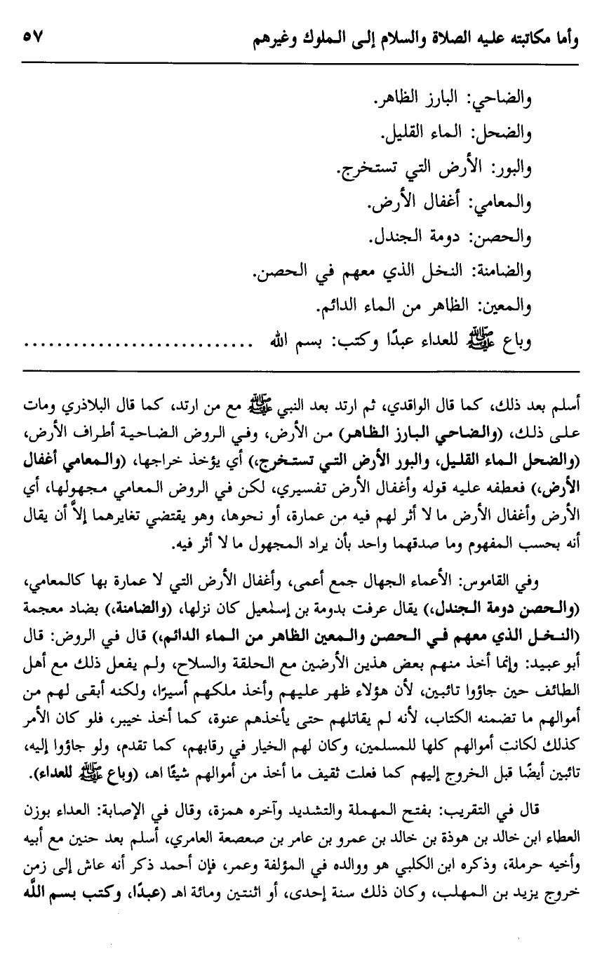 أسلم بعد ذلك، كما قال الواقدي، ثم ارتدَّ بعد النبي -صلى الله عليه وسلم- مع مَنْ ارتدَّ، كما قال البلاذري, ومات على ذلك، "والضاحي: البارز الظاهر" من الأرض، وفي الروض: الضاحية أطراف الأرض، "والضحل: الماء القليل، والبور: الأرض التي تستخرج"، أي يؤخذ خراجها، والمعامي: أغفال الأرض"، فعطفه عليه, قوله: وأغفال الأرض تفسيريّ، لكن في الروض: المعامي مجهولها، أي: الأرض وأغفال الأرض ما لا أثر لهم فيه من عمارة، أو نحوها، وهو يقتضي تغايرهما, إلّا أن يقال أنه بحسب المفهوم, وما صدقهما واحد بأن يراد المجهول ما لا أثر فيه.
