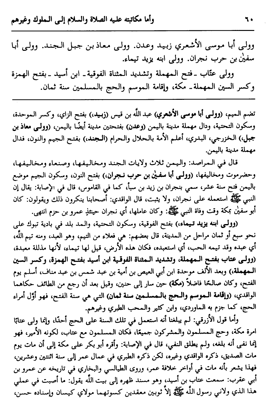 تضم الميم، "وولَّى أبا موسى الأشعري" عبد الله بن قيس "زبيد"، بفتح الزاي وكسر الموحدة وسكون التحتية ودال مهملة, مدينة باليمن, "وعدن" بفتحتين, مدينة أيضًا باليمن، "وولَّى معاذ بن جبل" الخزرجي البدري، أعلم الأمة بالحلال والحرام "الجند"، بفتح الجيم والنون، فدال مهملة مدينة باليمن.