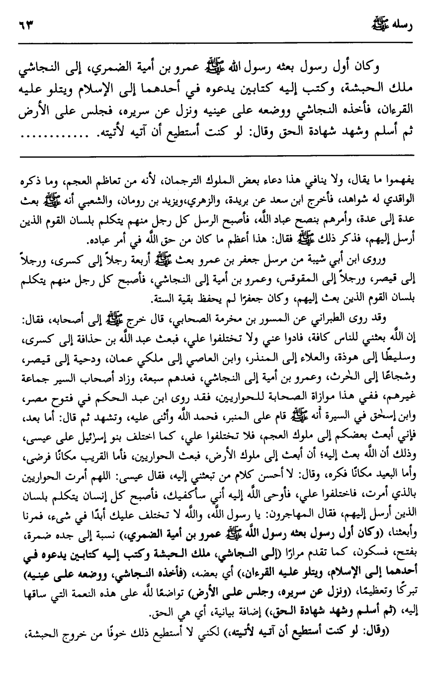وقد روى الطبراني عن المسور بن مخرمة الصحابي، قال: خرج -صلى الله عليه وسلم- إلى أصحابه، فقال: "إن الله بعثني للناس كافّة، فأدوا عني وا تختلفوا علي"، فبعث عبد الله بن حذافة إلى كسرى، وسليطًا إلى هوذة، والعلاء إلى المنذر، وابن العاص إلى ملكي عمان، ودحية إلى قيصر، وشجاعًا إلى الحارث، وعمرو بن أمية إلى النجاشي. فعدَّهم سبعة، وزاد أصحاب السير جماعة غيرهم، ففي هذا موازاة الصحابة للحواريين، فقد روى ابن عبد الحكم في فتوح مصر، وابن إسحاق في السيرة, أنه -صلى الله عليه وسلم- قام على المنبر، فحمد الله وأثنى عليه، وتشهَّد ثم قال: "أما بعد، فإني أبعث بعضكم إلى ملوك العجم، فلا تختلفوا علي كما اختلف بنو إسرائيل على عيسى، وذلك أن الله بعث إليه أن أبعث إلى ملوك الأرض، فبعث الحواريين، فأمَّا القريب مكانًا فرضي، وأما البعيد مكانًا فكره، وقال: لا أحسن كلام من تبعثني إليه، فقال عيسى: اللهمَّ أمرت الحواريين بالذي أمرت، فاختلفوا علي، فأوحى الله إليه أني سأكفيك، فأصبح كل إنسان يتكلّم بلسان الذين أرسل إليهم"، فقال المهاجرون: يا رسول الله، والله لا نختلف عليك أبدًا في شيء, فمرنا وابعثنا, "وكان أول رسول بعثه -صلى الله عليه وسلم- عمرو بن أمية الضمري" نسبة إلى جدِّه ضمرة -بفتح فسكون كما تقدَّم مرارًا, "إلى النجاشي ملك الحبشة, وكتب إليه كتابين, يدعوه في أحدهما إلى الإسلام، ويتلو عليه القرآن"، أي: بعضه، "فأخذه النجاشي، ووضعه على عينيه" تبركًا وتعظيمًا، "ونزل عن سريره، وجلس على الأرض" تواضعًا لله على هذه النعمة التي ساقها إليه، "ثم أسلم وشهد وشهادة الحق"، إضافة بيانية، أي: هي الحق. "وقال: لو كنت أستطيع أن آتيه لأتيته"، لكنِّي لا أستطيع ذلك خوفًا من خروج الحبشة،