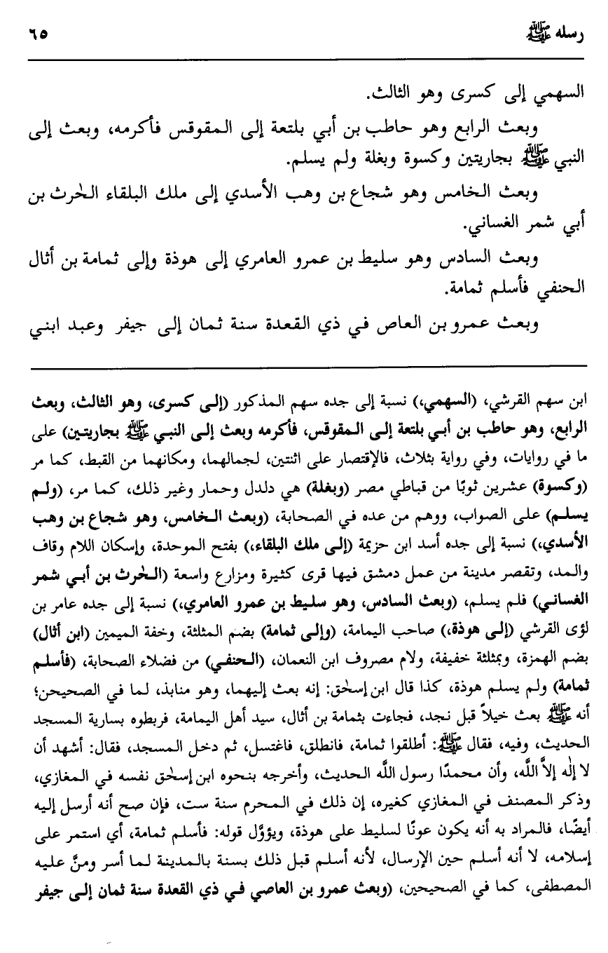 ابن سهم القرشي، "السهمي" نسبة إلى جدِّه سهم المذكور "إلى كسرى، وهو الثالث، وبعث الرابع، وهو حاطب بن أبي بلتعة إلى المقوقس، فأكرمه وبعث إلى النبي -صلى الله عليه وسلم- بجاريتين" على ما في روايات، وفي رواية بثلاث، فالاقتصار على اثنتين لجمالهما ومكانهما من القبط، كما مَرَّ "وكسوة" عشرين ثوبًا من قباطي مصر, "وبغلة" هي دلدل, وحمار, وغير ذلك، كما مَرَّ، "ولم يسلم على الصواب، ووَهِمَ من عده في الصحابة، "وبعث الخامس، وهو شجاع بن وهب الأسدي" نسبة إلى جده أسد بن حزيمة "إلى ملك البلقاء" بفتح الموحدة، وإسكان اللام وقاف والمد، وتقصر مدينة من عمل دمشق, فيها قرى كثيرة ومزارع واسعة "الحارث بن أبي شمر الغساني" فلم يسلم، "وبعث السادس، وهو سليط بن عمرو العامري"، نسبة إلى جده عامر بن لؤي القرشي "إلى هوذة" صاحب اليمامة، "وإلى ثمامة" بضم المثلثة، وخفة الميمين "ابن أثال" بضم الهمزة، وبمثلثة خفيفة، ولام, مصروف, ابن النعمان، "الحنفي" من فضلاء الصحابة، "فأسلم ثمامة" ولم يسلم هوذة، كذا قال ابن إسحاق: إنه بعث إليهما، وهو منابذ لما في الصحيحين أنه -صلى الله عليه وسلم- بعث خيلًا قِبَلَ نجد، فجاءت بثمامة بن أثال، سيد أهل اليمامة، فربطوه بسارية المسجد. الحديث، وفيه: فقال -صلى الله عليه وسلم: "أطلقوا ثمامة"، فانطلق, فاغتسل، ثم دخل المسجد، فقال: أشهد أن لا إله إلا الله، وأن محمدًا رسول الله. الحديث، وأخرجه بنحوه ابن إسحاق نفسه في المغازي، وذكر المصنف في المغازي كغيره: إن ذلك في المحرم سنة ست، فإن صحَّ أنه أرسل إليه أيضًا، فالمراد به أنه يكون عونًا لسليط على هوذة، ويئول قوله: فأسلم ثمامة، أي: استمرَّ على إسلامه، لا أنه أسلم حين الإرسال؛ لأنه أسلم قبل ذلك بسنة, بالمدينة لما أُسِرَ ومنَّ عليه المصطفى، كما في الصحيحين، "وبعث عمرو بن العاص في ذي القعدة سنة ثمان إلى جيفر