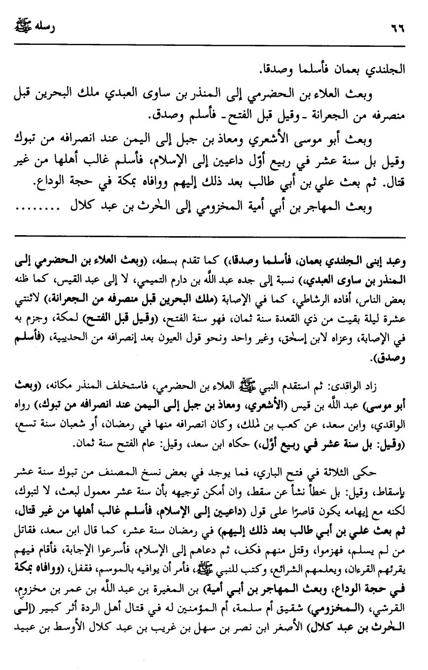 وعبد ابني الجلندي بعمان، فأسلما وصدقا"، كما تقدَّم بسطه، "وبعث العلاء بن الحضرمي إلى المنذر بن ساوى العبدي" نسبة إلى جدِّه عبد الله بن دارم التميمي، لا إلى عبد القيس, كما ظنَّه بعض الناس، أفاده الرشاطي، كما في الإصابة "ملك البحرين قبل منصرفه من الجعرانة"، لاثنتي عشرة ليلة بقيت من ذي القعدة سنة ثمان، فهو سنة الفتح، "وقيل: قبل الفتح" لمكة، وجزم به في الإصابة، وعزاه لابن إسحاق، وغير واحد, ونحو قول العيون بعد إنصرافه من الحديبية، "فأسلم وصدَّق".