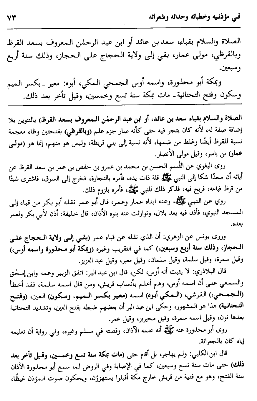 وروى يونس عن الزهري: أن الذي نقله عن قباء عمر "بقي إلى ولاية الحجاج على الحجاز، وذلك سنة أربع وسبعين"، كما في التقريب وغيره. "وبمكة أبو محذورة واسمه: أوس"، وقيل: سمرة، وقيل: سلمة، وقيل: سلمان، وقيل: معير، وقيل: عبد العزيز.