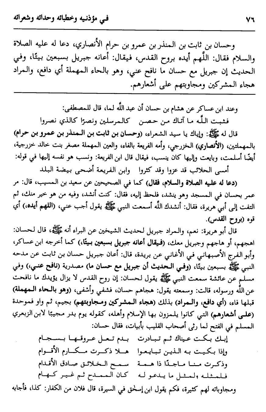 وحسان بن ثابت بن المنذر بن عمرو بن حرام الأنصاري، دعا له -عليه الصلاة والسلام- فقال: "اللهم أيده بروح القدس"، فيقال: أعانه جبريل بسبعين بيتًا، وفي الحديث: "إن جبريل مع حسان ما نافح عني"، وهو بالحاء المهملة, أي: دافع، والمراد هجاء المشركين ومجاوبتهم على أشعارهم.
