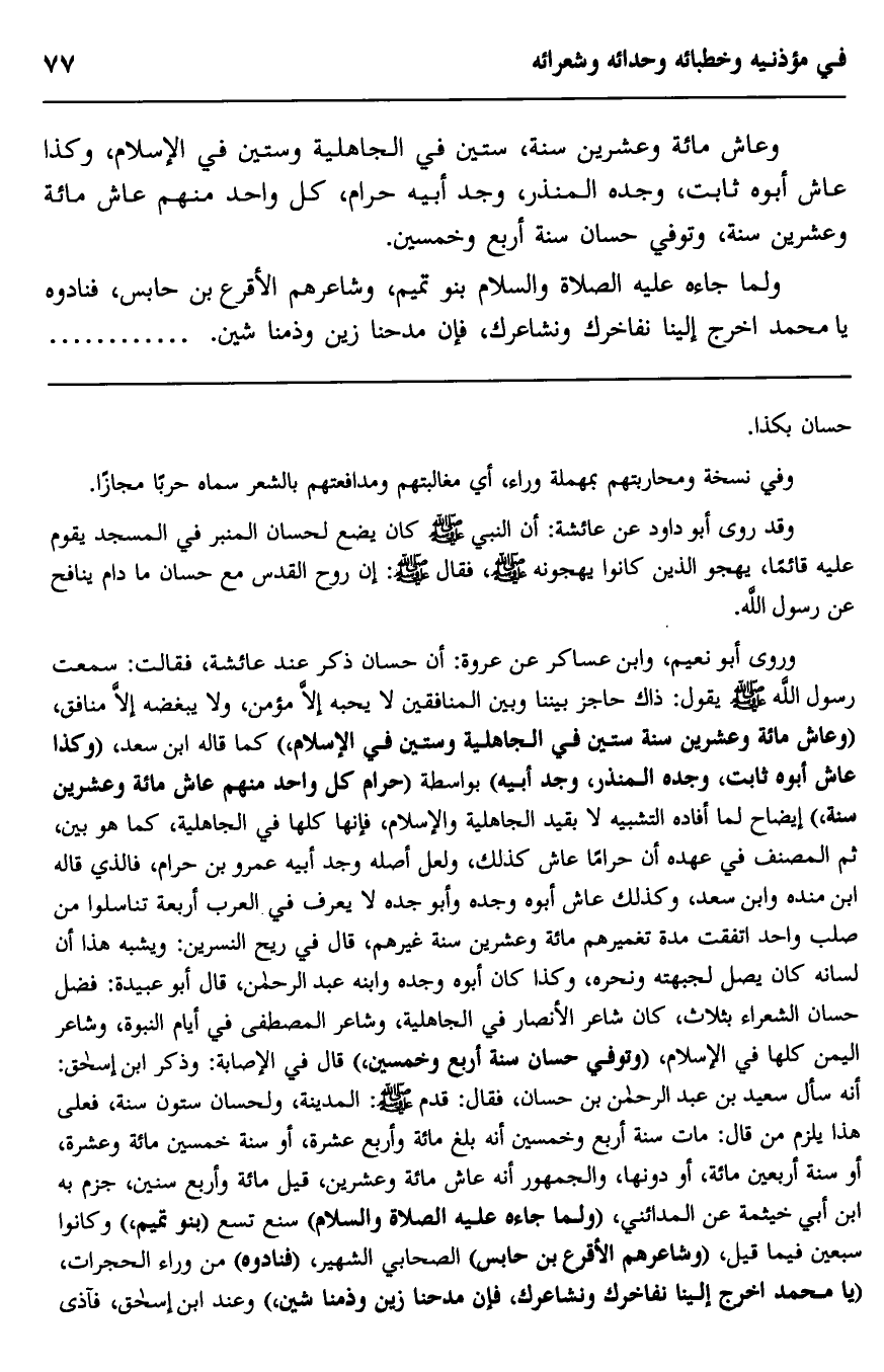 وروى أبو نعيم، وابن عساكر عن عروة: أن حسان ذكر عند عائشة، فقالت: سمعت رسول الله -صلى الله عليه وسلم- يقول: "ذاك حاجز بيننا وبين المنافقين, لا يحبه إلا مؤمن، ولا يبغضه إلا منافق" , وعاش مائة وعشرين سنة: ستين في الجاهلية وستين في الإسلام" كما قاله ابن سعد، "وكذا عاش أبوه ثابت، وجده المنذر، وجد أبيه" بواسطة "حرام, كل واحد منهم عاش مائة وعشرين سنة"، إيضاح لما أفاده التشبيه, لا بقيد الجاهلية والإسلام، فإنها كلها في الجاهلية، كما هو بَيِّن، ثم المصنف في عهده أن حرام عاش كذلك، ولعل أصله وجد أبيه عمرو بن حرام، فالذي قاله ابن منده وابن سعد: وكذلك عاش أبوه وجده وأبو جده, لا يعرف في العرب أربعة تناسلوا من صلب واحد اتفقت مدة تعميرهم مائة وعشرين سنة غيرهم، قال في ريح النسرين: ويشبه هذا أن لسانه كان يصل لجبهته ونحره، وكذا كان أبوه وجده وابنه عبد الرحمن، قال أبو عبيدة: فضل حسان الشعراء بثلاث، كان شاعر الأنصار في الجاهلية، وشاعر المصطفى في أيام النبوة، وشاعر اليمن كلها في الإسلام، "وتوفي حسان سنة أربع وخمسين" قال في الإصابة: وذكر ابن إسحاق أنه سأل سعيد بن عبد الرحمن بن حسان، فقال: قدم -صلى الله عليه وسلم- المدينة، ولحسان ستون سنة، فعلى هذا يلزم من قال: مات سنة أربع وخمسين أنه بلغ مائة وأربع عشرة، أو سنة خمسين مائة وعشرة، أو سنة أربعين مائة أو دونها، والجمهور أنه عاش مائة وعشرين، قيل مائة وأربع سنين، جزم به ابن أبي خيثمة عن المدائني، "ولما جاءه -عليه الصلاة والسلام" سنع تسع "بنو تميم"، وكانوا سبعين فيما قيل، "وشاعرهم الأقرع بن حابس" الصحابي الشهير، "فنادوه" من وراء الحجرات، "يا محمد, اخرج إلينا نفاخرك ونشاعرك، فإن مدحنا زين, وذمَّنا شين"، وعند ابن إسحاق، فآذى