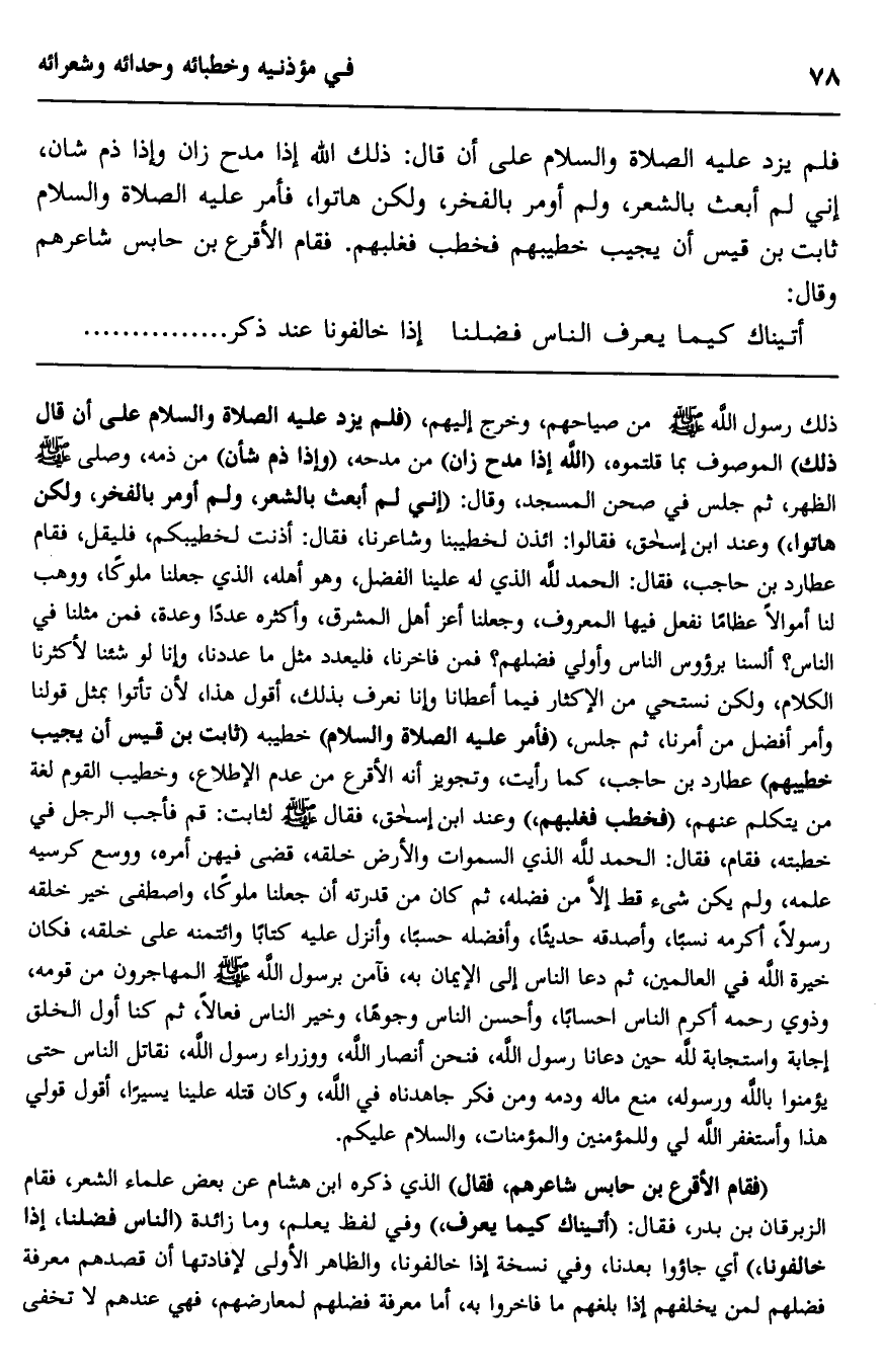 فلم يزد -عليه الصلاة والسلام- على أن قال: "ذلك الله, إذا مدح زان, وإذا ذمَّ شان، إني لم أبعث بالشعر، ولم أؤمر بالفخر، ولكن هاتوا"، فأمر -عليه الصلاة والسلام- ثابت بن قيس أن يجيب خطيبهم فخطب فغلبهم، فقام الأقرع بن حابس شاعرهم وقال: