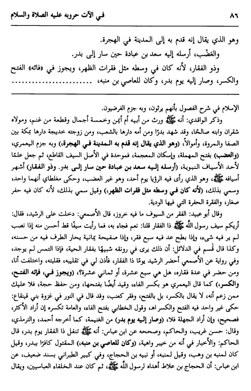 وقال أبو عبيد: الفقر من السيوف ما فيه خروز. قال الأصمعي: دخلت على الرشيد فقال: أريكم سيف رسول الله -صلى الله عليه وسلم- ذا الفقار, قلنا: نعم, فجاء به، فما رأيت سيفًا قط أحسن منه, إذا نُصِبَ لم ير فيه شيء، وإذا بطح عُدَّ فيه سَبُع فقر، وإذا صفيحة يمانية يحار الطرف فيه من حسنه. وكذا قال قاسم في الدلائل: إن ذلك يرى في رونقه شبيهًا بفقار الحية، فإذا التمس لم يوجد، وفي رواية عن الأصمعي أحضر الرشيد يومًا ذا الفقار، فأذن لي في تقليبه فقلَّبته، واختلفت أنا ومن حضر في عدة فقاره، هل هي سبع عشرة، أو ثماني عشرة؟ "ويجوز في فائه الفتح، والكسر"، كما قال اليعمري: هو بكسر الفاء، وقيل أيضًا: بفتحها، ومن حفظ حجة فلا عليك ممن زعم أنه لا يقال: بالكسر، بل بالفتح، وفقر كعنب، وقد قال في النور في غزوة بني قينقاع: حكى غير واحد فيه الفتح والكسر أ. هـ، وقول الخطابي: بفتح الفاء، والعامة تكسره, إن أراد الأكثر فصحيح، وإن أراد الجهلة فلا، "وصار إليه يوم بدر" من الغنيمة، كما أخرجه أحمد والترمذي وقال: حسن غريب، والحاكم، وصحَّحه عن ابن عباس: أنه -صلى الله عليه وسلم- تنفل ذا الفقار يوم بدر، قال الحاكم: والأخبار في أنه من خيبر واهية، "وكان للعاص بن منبه" المقتول كافرًا ببدر، وقيل: كان لمنبه بن وهب، وقيل: لمنبه أو نبيه بن الحجاج، وفي كبير الطبراني بسند ضعيف، عن ابن عباس: أن الحجاج بن علاط أهداه لرسول الله -صلى الله عليه وسلم، ثم كان عند الخلفاء العباسيين، ويقال