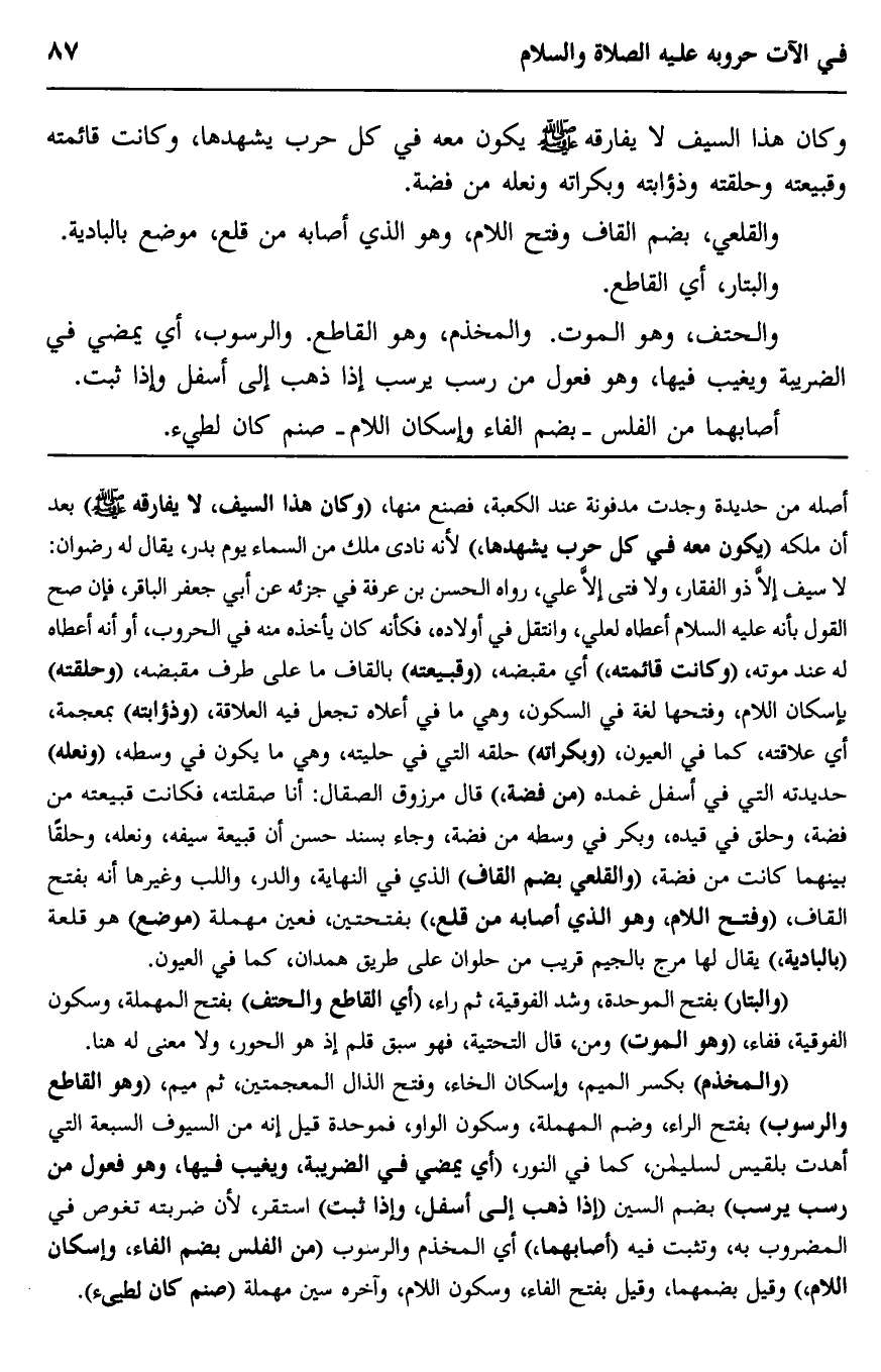 أصله من حديدة وُجِدَت مدفونة عند الكعبة فصُنِعَ منها، "وكان هذا السيف لا يفارقه -صلى الله عليه وسلم" بعد أن ملكه, "يكون معه في كل حرب يشهدها"؛ لأنه نادى مَلَك من السماء يوم بدر -يقال له رضوان: لا سيف إلّا ذو الفقار، ولا فتى إلّا علي. رواه الحسن بن عرفة في جزئه عن أبي جعفر الباقر، فإن صحَّ القول بأنه -عليه السلام- أعطاه لعلي، وانتقل في أولاده، فكأنَّه كان يأخذه منه في الحروب، أو أنه أعطاه له عند موته، "وكانت قائمته" أي: مقبضه، "وقبيعته" بالقاف ما على طرف مقبضه، "وحلقته" بإسكان اللام وفتحها لغة في السكون، وهي ما في أعلاه تجعل فيه العلاقة، "وذؤابته" بمعجمة، أي: علاقته -كما في العيون، "وبكراته" حلقه التي في حليته، وهي ما يكون في وسطه، "ونعله" حديدته التي في أسفل غمده "من فضة"، قال مرزوق الصقال: أنا صقلته، فكانت قبعته من فضة، وحلق في قيده، وبكر في وسطه من فضة. وجاء بسند حسن أن قبيعة سيفه، ونعله، وحلقًا بينهما كانت من فضة، "والقلعي -بضم القاف" الذي في النهاية، والدر، واللب غيرها أنه بفتح القاف، "وفتح اللام، وهو الذي أصابه من قلع"، بفتحتين، فعين مهملة "موضع" هو قلعة "بالبادية"، يقال لها مرج بالجيم، وشدّ الفوقية، ثم راء، "أي: القاطع الحتف" بفتح المهملة، وسكون الفوقية ففاء، "وهو الموت" ومن قال: التحتية، فهو سبق قلم؛ إذ هو الحور، ولا معنى له هنا.