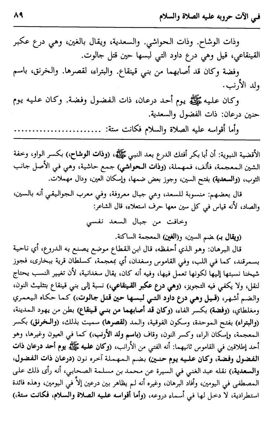 وكان عليه -صلى الله عليه وسلم- يوم أحد درعان، ذات الفضول وفضة. وكان عليه يوم حنين درعان: ذات الفضول والسعدية.