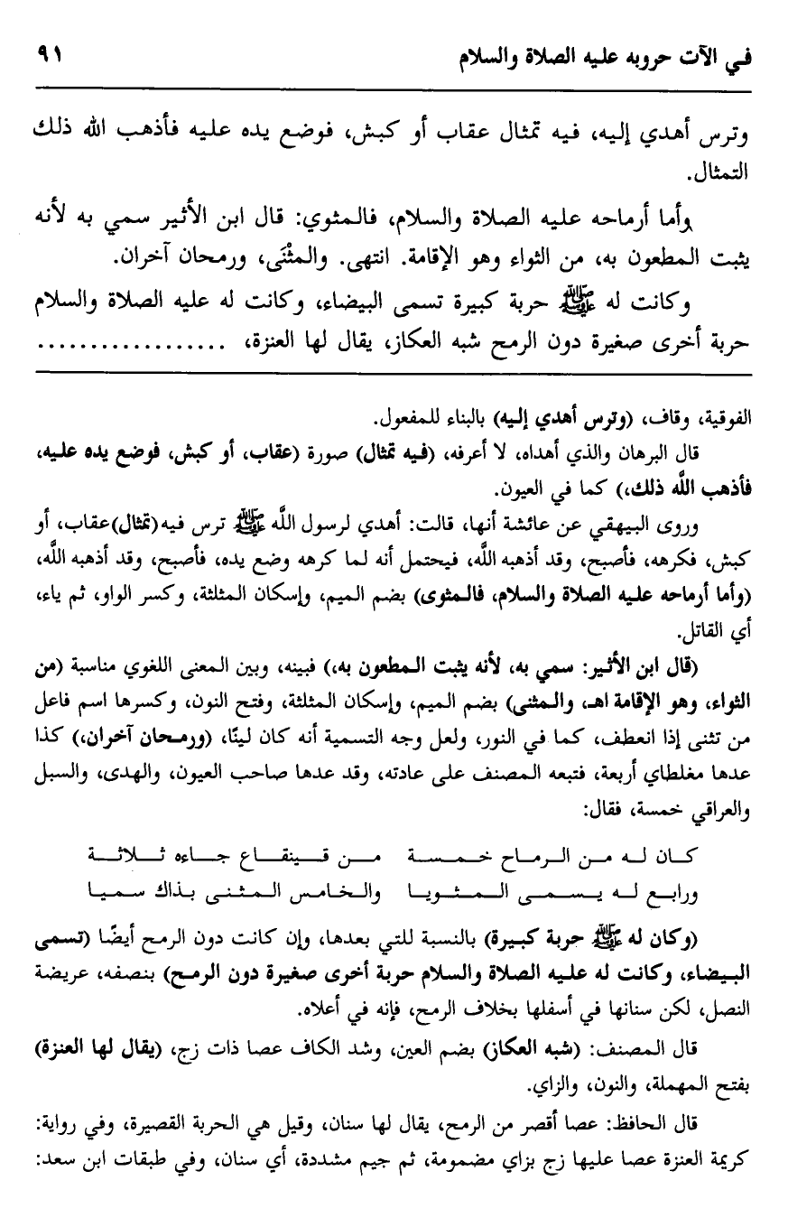 وكانت له -صلى الله عليه وسلم- حربة كبيرة تسمَّى البيضاء، وكانت له -عليه الصلاة والسلام- حربة أخرى صغيرة دون الرمح, شبه العكاز، يقال لها: العنزة,