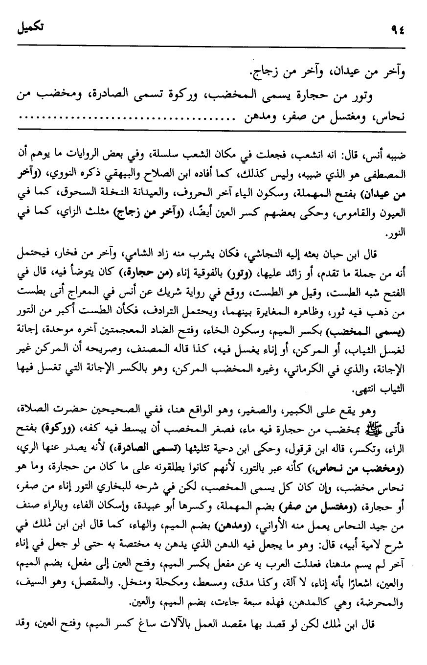 وتور من حجارة يسمَّى المخضب، وركوة تسمَّى الصادرة، ومخضب من نحاس، ومغتسل من صفر، ومدهن.