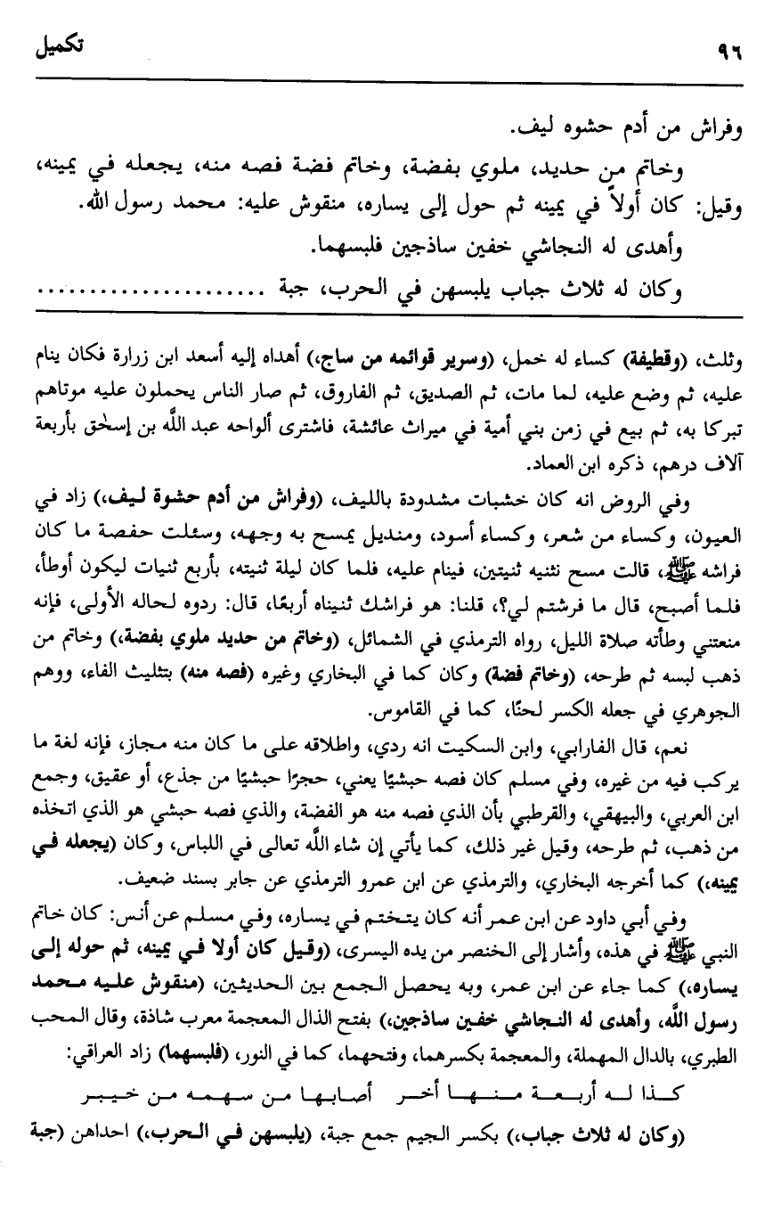 وفي الروض: إنه كان خشبات مشدودة بالليف، "وفراش من أدم حشوه ليف"، زاد في العيون: وكساء من شعر، وكساء أسود، ومنديل يمسح به وجهه، وسُئِلَت حفصة: ما كان فراشه -صلى الله عليه وسلم، قالت: مسح نثنيه ثنيتين، فينام عليه، فلمَّا كان ليلة ثنيته بأربع ثنيات ليكون أوطأ، فلما أصبح، قال: "ما فرشتم لي"؟ قلنا: هو فراشك ثنيناه أربعًا، قال: "ردوه لحاله الأولى، فإنه منعتني وطأته صلاة الليل"، رواه الترمذي في الشمائل، "وخاتم من حديد ملوي بفضة"، وخاتم من ذهب لبسه ثم طرحه، "وخاتم فضة" وكان كما في البخاري وغيره "فصه منه" بتثليث الفاء، ووَهِمَ الجوهري في جعله الكسر لحنًا، كما في القاموس.