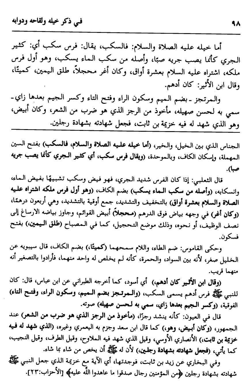 قال في العيون: كأنَّه ينشد رجزًا، "مأخوذ من الرجز الذي هو ضرب من الشعر" عند الجمهور، "وكان أبيض وهو" كما قال ابن سعد وجزم به اليعمري وغيره، "الذي شهد له فيه خزيمة بن ثابت"، الأنصاري الأوسي، وقيل: الذي شهد فه الملاوح، وقيل: الطرف، وقيل: النجيب، كما يأتي، "فجعل شهادته بشهادة رجلين"؛ لأن له -صلى الله عليه وسلم- أن يخصَّ من شاء بما شاء.