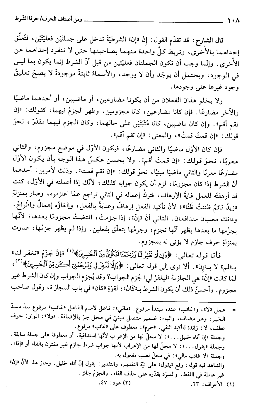 قال الشارح: قد تقدّم القول: إِنّ "إن" الشرطيّةَ تدخل على جملتَين فعليّتَين، فتُعلَّق إحداهما بالأُخرى، وتربط كلَّ واحدة منهما بصاحبتها حتى لا تنفرد إحداهما عن الأُخرى. وإنّما وجب أن تكون الجملتان فعليّتين من قبل أن الشرط إنما يكون بما ليس في الوجود، ويحتمل أن يوجَد وأن لا يوجد، والأسماءُ ثابتةٌ موجودة لا يصح تعليقُ وجود غيرها على وجودها.