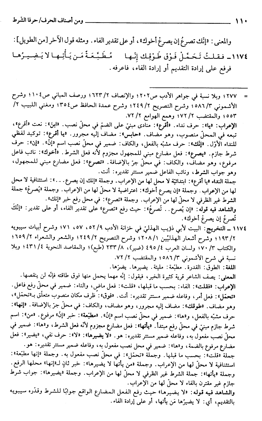 والشاهد فيه قوله: "إن يُصرع .. تُصرعُ": حيث رفع "تصرع" على تقدير الفاء، أو على تقدير: "إنَّكَ تُصرعُ إن يصرعْ أخوك".