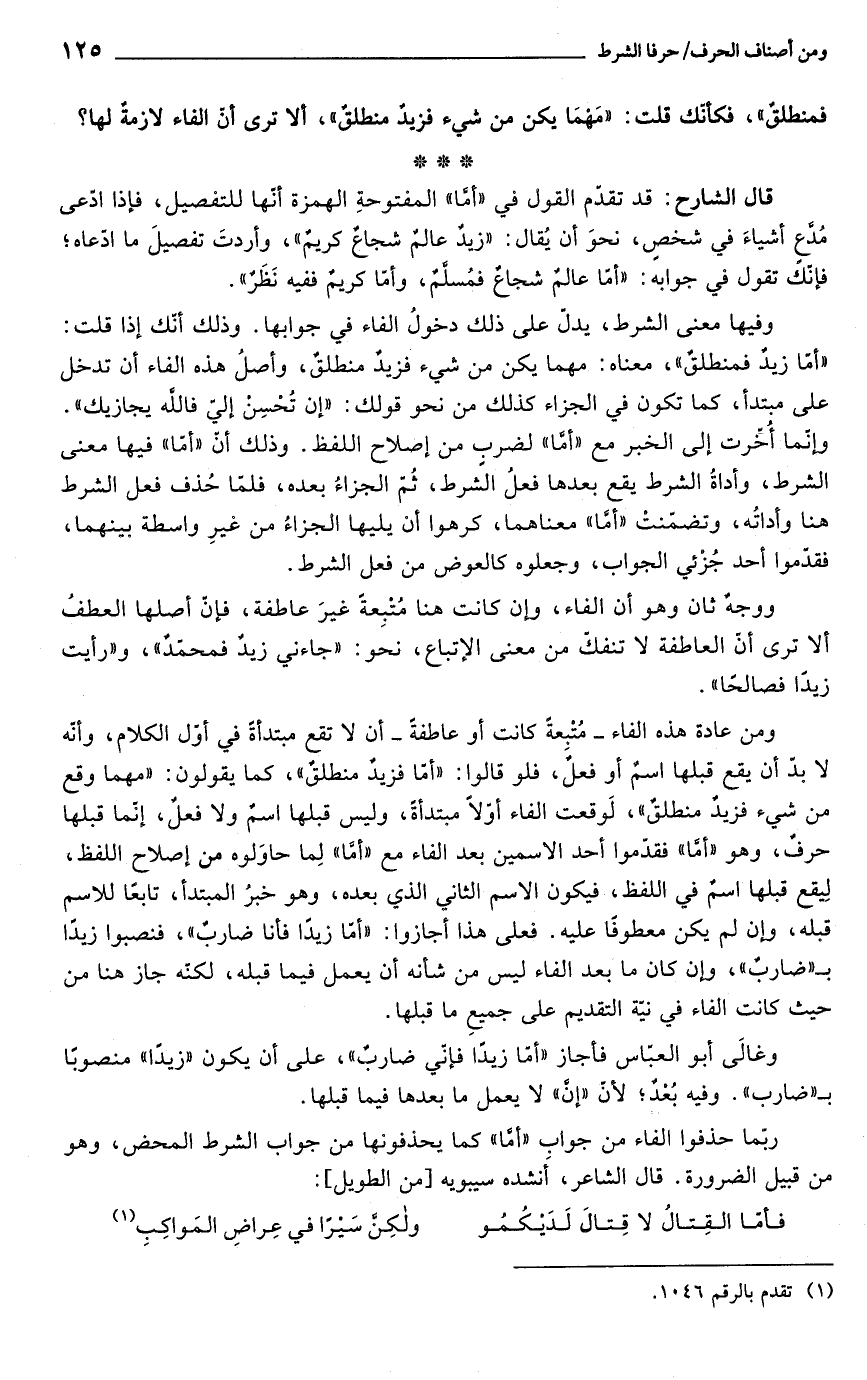 قال الشارح: قد تقدّم القول في "أمَّا" المفتوحةِ الهمزة أنّها للتفصيل، وإذا ادّعى مُدَّعٍ أشياءَ في شخصٍ، نحوَ أن يُقال: "زيدٌ عالمٌ شجاعٌ كريمٌ"، وأردتَ تفصيلَ ما ادّعاه؛ فإنّك تقول في جوابه: "أمّا عالمٌ شجاعٌ فمُسلَّمٌ، وأمّا كريمٌ ففيه نَظَرٌ".