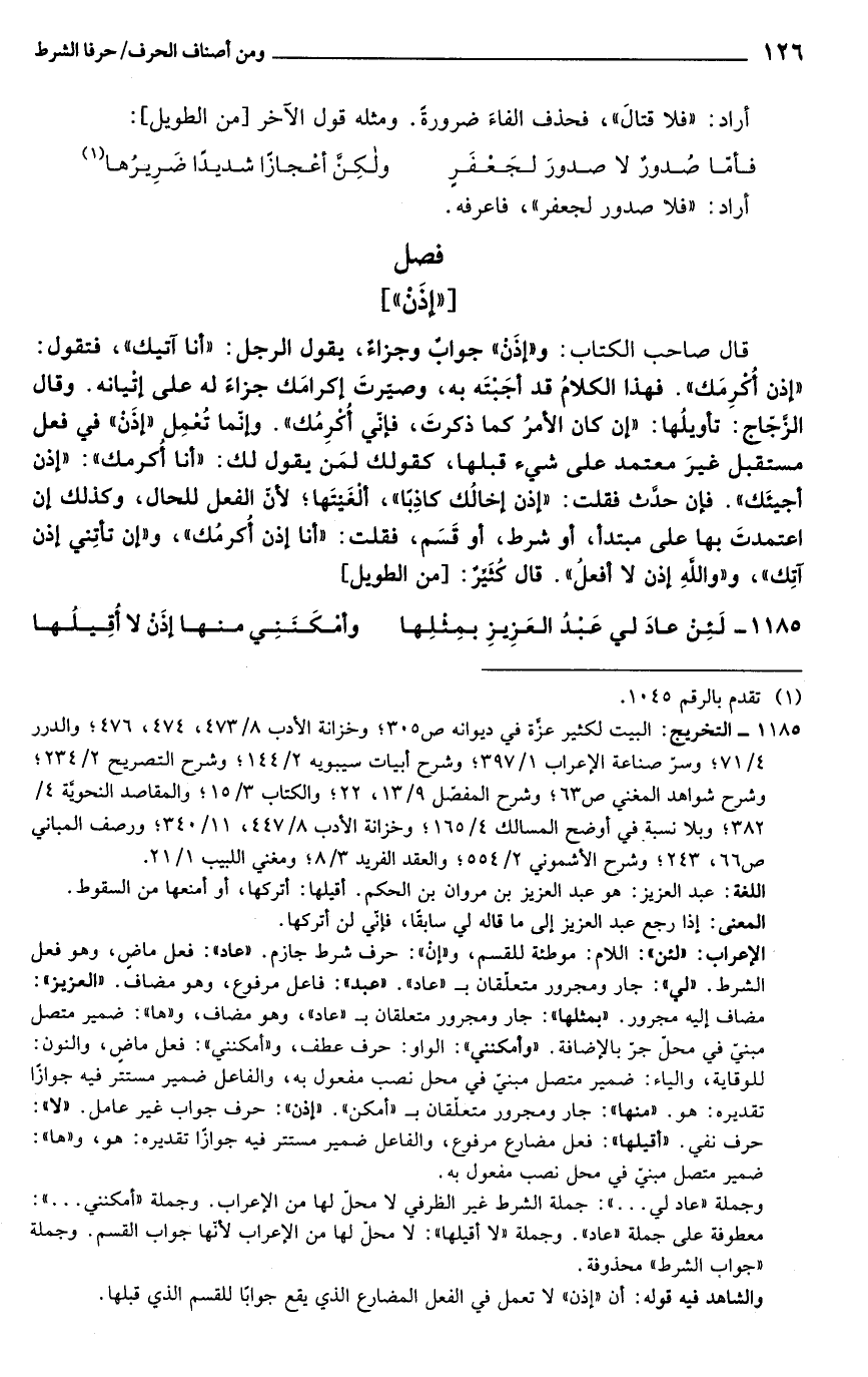 1185 - التخريج: البيت لكثير عزَّة في ديوانه ص 305؛ وخزانة الأدب 8/ 473، 474، 476؛ والدرر 4/ 71؛ وسرّ صناعة الإعراب 1/ 397؛ وشرح أبيات سيبويه 2/ 144؛ وشرح التصريح 2/ 234؛ وشرح شواهد المغني ص 63؛ وشرح المفصّل 9/ 13، 22؛ والكتاب 3/ 15؛ والمقاصد النحوية 4/ 382؛ وبلا نسبة في أوضح المسالك 4/ 165؛ وخزانة الأدب 8/ 447، 11/ 340؛ ورصف المباني ص 66، 243؛ وشرح الأشموني 2/ 554؛ والعقد الفريد 3/ 8؛ ومغني اللبيب 1/ 21.