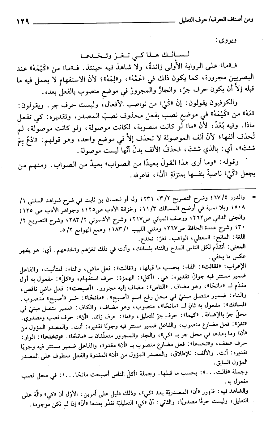 والشاهد فيه: ظهور "أن" المصدريّة بعد "كي"، وذلك دليل على أمرين: الأول أن "كي" دالَّة على التعليل، وليست حرفا مصدريًّا، والثاني: أنّ "كي" التعليليّة تقدَّر بعدها "أنْ" إذا لم تكن موجودة.