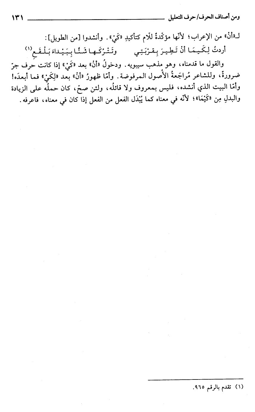 والقول ما قدمناه، وهو مذهب سيبويه. ودخولُ "أنْ" بعد "كَيْ" إذا كانت حرف جرّ ضرورة، وللشاعر مُراجَعةُ الأُصول المرفوضة. وأمّا ظهورُ "أنْ" بعد "لِكَيْ" فما أبعدَه! وأمّا البيت الذي أنشده، فليس بمعروف ولا قائلُه، ولئن صحّ، كان حملُه على الزيادة والبدلِ مِن "كَيْمَا"؛ لأنه في معناه كما يُبدَل الفعل من الفعل إذا كان في معناه، فاعرفه.
