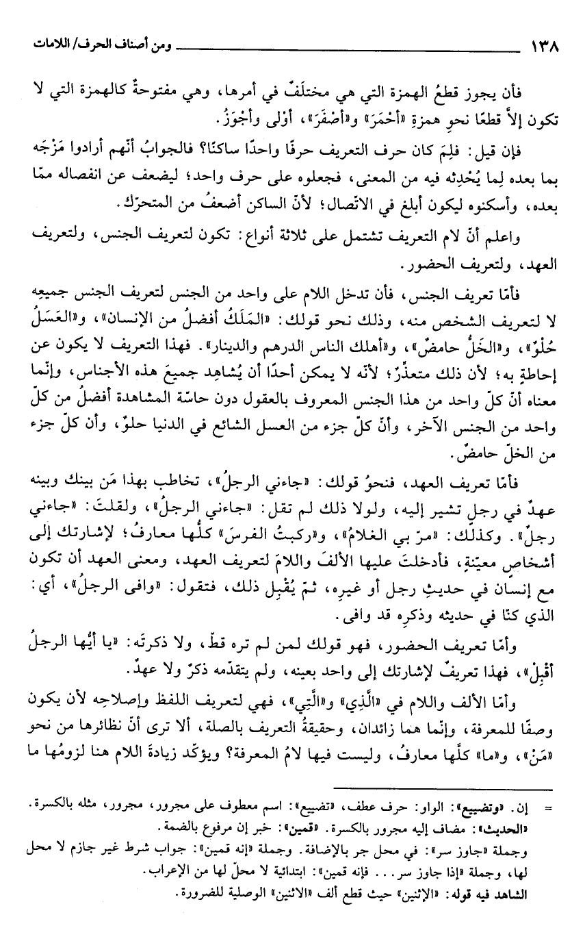 واعلم أنّ لام التعريف تشتمل على ثلاثة أنواع: تكون لتعريف الجنس، ولتعريف العهد، ولتعريف الحضور.