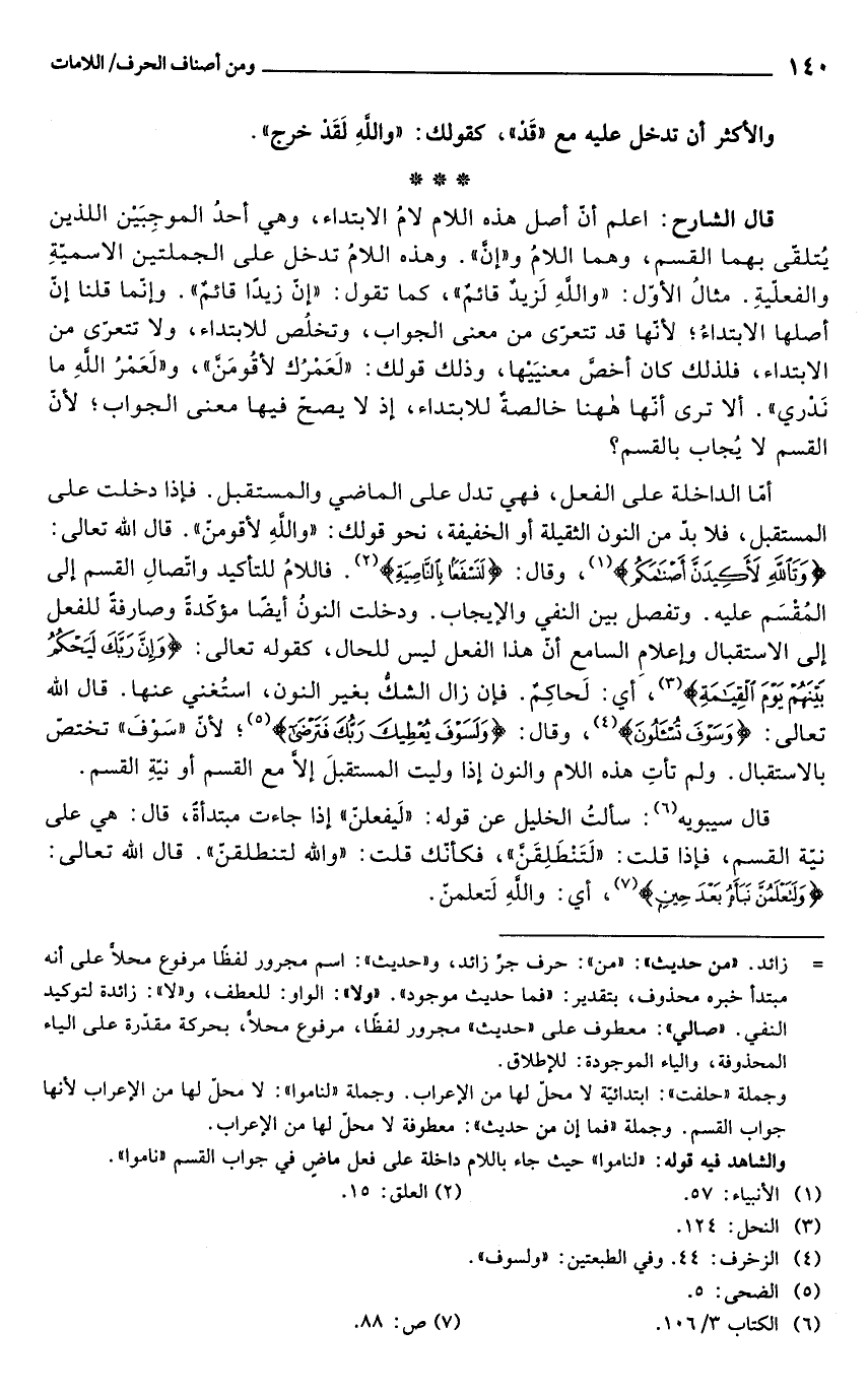 قال الشارح: اعلم أنّ أصل هذه اللام لامُ الابتداء، وهي أحدُ الموجِبَيْن اللذين يُتلقّى بهما القسم، وهما اللامُ و"إنَّ". وهذه اللامُ تدخل على الجملتين الاسميّةِ والفعلّيةِ. مثالُ الأوّل: "واللهِ لَزيدٌ قائمٌ"، كما تقول: "إنّ زيدًا قائمٌ". وإنّما قلنا إنّ أصلها الابتداءُ؛ لأنّها لحد تتعرّى من معنى الجواب، وتخلُص للابتداء، ولا تتعرّى من الابتداء، فلذلك كان أخصَّ معنيَيْها، وذلك قولك: "لَعَمْرُك لأقُومَنَّ"، و"لَعَمْرُ اللهِ ما نَدْري". ألا ترى أنّها ههنا خالصةٌ للابتداء، إذ لا يصحّ فيها معنى الجواب؛ لأنّ القسم لا يُجاب بالقسم؟