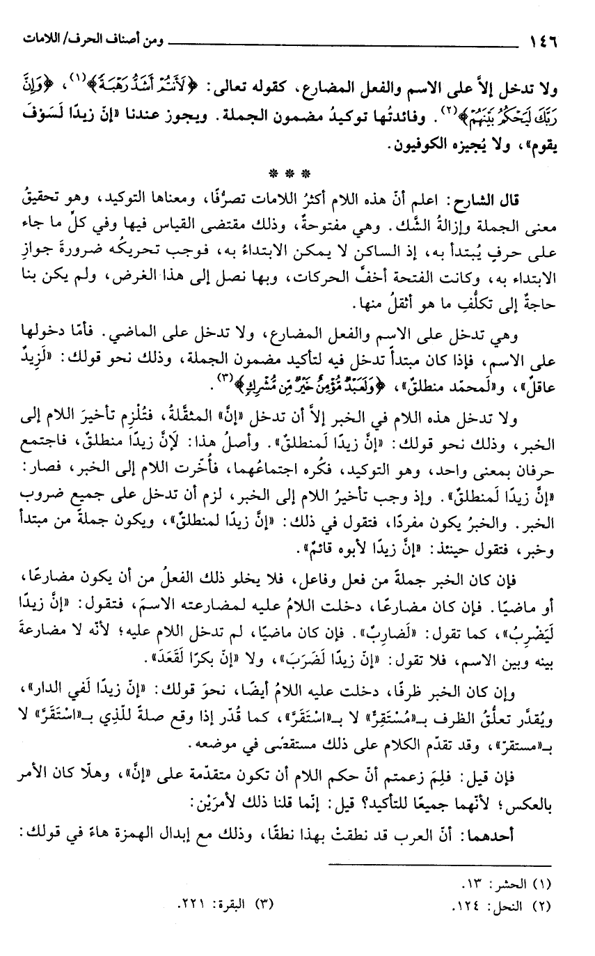 قال الشارح: اعلم أن هذه اللام أكثرُ اللامات تصرُّفًا، ومعناها التوكيد، وهو تحقيقُ معنى الجملة وإزالةُ الشك. وهي مفتوحة، وذلك مقتضى القياس فيها وفي كل ما جاء على حرفٍ يُبتدأ به، إذ الساكن لا يمكن الابتداءُ به، فوجب تحريكُه ضرورةَ جوازِ الابتداء به، وكانت الفتحة أخفّ الحركات، وبها نصل إلى هذا الغرض، ولم يكن بنا حاجة إلى تكلُّفِ ما هو أثقلُ منها.