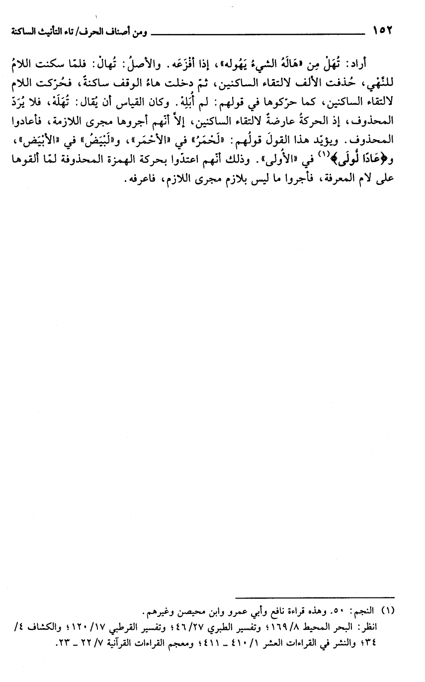 أراد: تُهَل مِن "هَالَه الشيءُ يَهُوله"، إذا أفزَعَه. والأصلُ: تُهال: فلمّا سكنت اللامُ للنَّهي، حُذفت الألف لالتقاء الساكنين، ثمّ دخلت هاءُ الوقف ساكنةً، فحُرّكت اللام لالتقاء الساكنين، كما حرّكوها في قولهم: لم أُبَلِه. وكان القياس أن يُقال: تهَلَه، فلا يرَدّ المحذوف، إذ الحركةُ عارضةٌ لالتقاء الساكنين، إلَّا أنهم أجروها مجرى اللازمة، فأعادوا المحذوف. ويؤيّد هذا القولَ قولُهم. "لَحْمَرُ" في "الأحَمر"، و"لَبيَضُ" في "الأبْيَض"، و {عَادَا لولَى} (¬1) في "الأولى". وذلك أّنهم اعتدّوا بحركة الهمزة المحذونة لمّا ألقوها على لام المعرفة، فأجروا ما ليس بلازم مجرى اللازم، فاعرفه.