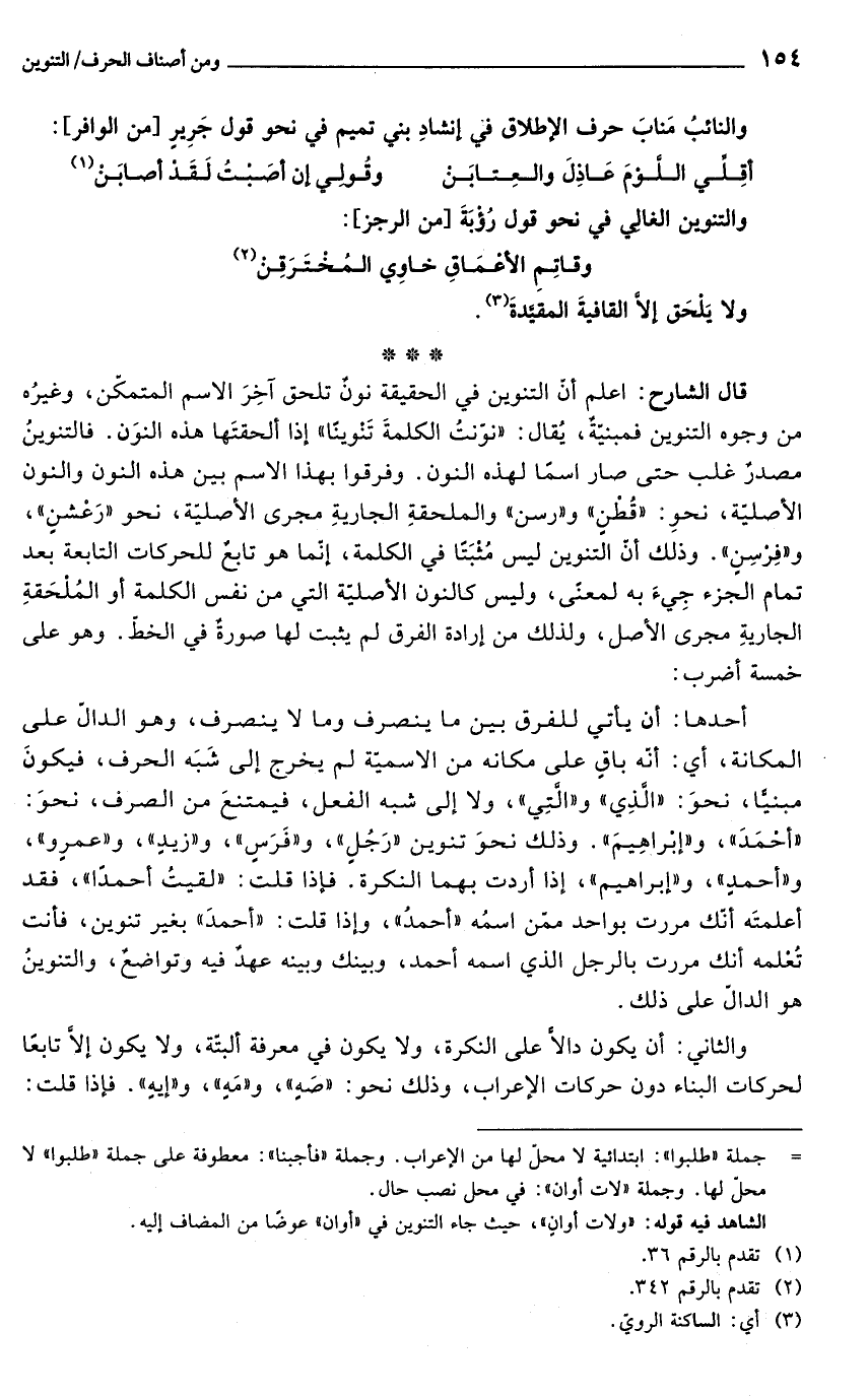 قال الشارح: اعلم أنّ التنوين في الحقيقة نونٌ تلحق آخِرَ الاسم المتمكّن، وغيرُه من وجوه التنوين فمبنيةٌ، يُقال: "نوّنتُ الكلمةَ تَنْوينًا" إذا ألحقتَها هذه النوَن. فالتنوينُ مصدرٌ غلب حتى صار اسمًا لهذه النون. وفرقوا بهذا الاسم بين هذه النون والنون الأصليّة، نحوِ: "قُطْنٍ" و"رسن" والملحقةِ الجاريةِ مجرى الأصليّة، نحو "رَعْشنٍ"، و"فِرْسِن". وذلك أنّ التنوين ليس مُثبَتًا في الكلمة، إنّما هو تابعٌ للحركات التابعة بعد تمام الجزء جِيءَ به لمعنًى، وليس كالنون الأصليّة التي من نفس الكلمة أو المُلْحَقةِ الجاريةِ مجرى الأصل، ولذلك من إرادة الفرق لم يثبت لها صورةٌ في الخطّ. وهو على خمسة أضرب: