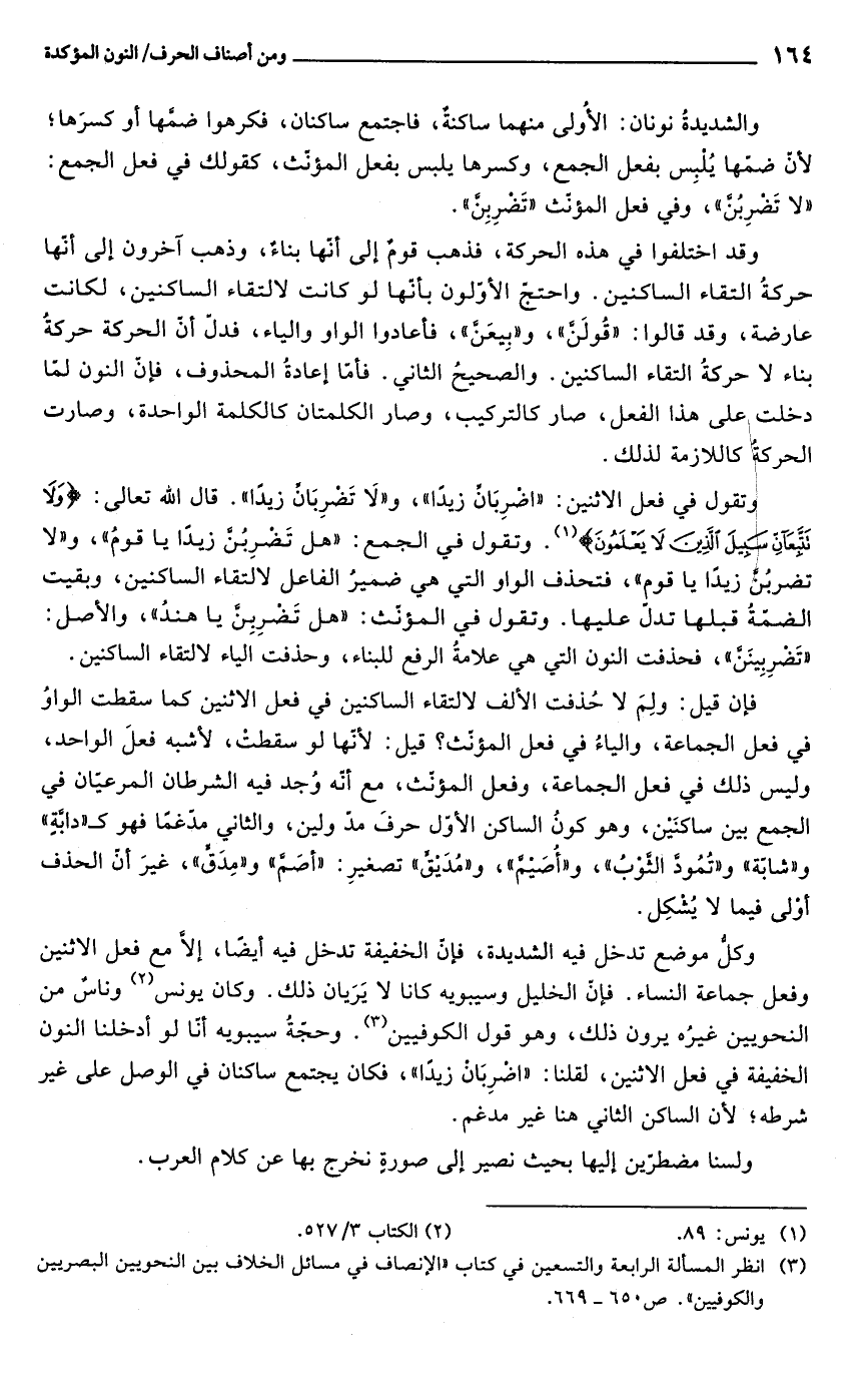 وكل موضع تدخل فيه الشديدة، فإنّ الخفيفة تدخل فيه أيضًا، إلَّا مع فعل الاثنين وفعل جماعة النساء. فإنّ الخليل وسيبويه كانا لا يَرَيان ذلك. وكان يونس (¬2) وناسٌ من النحويين غيره يرون ذلك، وهو قول الكوفيين (¬3). وحجّةُ سيبويه أنّا لو أدخلنا النون الخفيفة في فعل الاثنين، لقلنا: "اضرِبَانْ زيدًا"، فكان يجتمع ساكنان في الوصل على غير شرطه؛ لأن الساكن الثاني هنا غير مدغم.