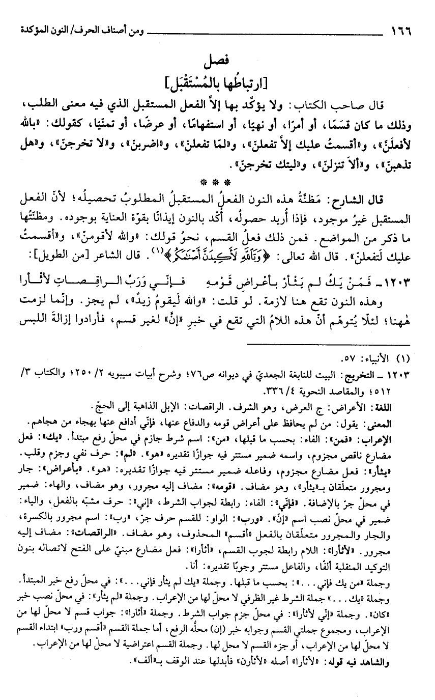 قال الشارح: مَظنَّةُ هذه النون الفعلُ المستقبلُ المطلوبُ تحصيلُه؛ لأنّ الفعل المستقبل غيرُ موجود، فإذا أُريد حصولُه، أُكّد بالنون إيذانًا بقوّة العناية بوجوده. ومظنّتُها ما ذكر من المواضع. فمن ذلك فعلُ القسم، نحوُ قولك: "والله لأقومنّ"، و"أقسمتُ علمِك لَتفعلنّ". قال الله تعالى: {وَتَاللَّهِ لَأَكِيدَنَّ أَصْنَامَكُمْ} (¬1). قال الشاعر [من الطويل]: