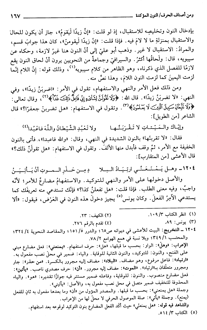 فقال: "لا تقربنّها" بالنون الشديدة في النهي، وقال: "والله فاعبدا"، فأتى بالنون الخفيفة مع الأمر، ثمَّ وقف فأبدل منها الألفَ. وتقول في الاستفهام: "هل تقولَنَّ ذلك؟ " قال الأعشى [من المتقارب]: