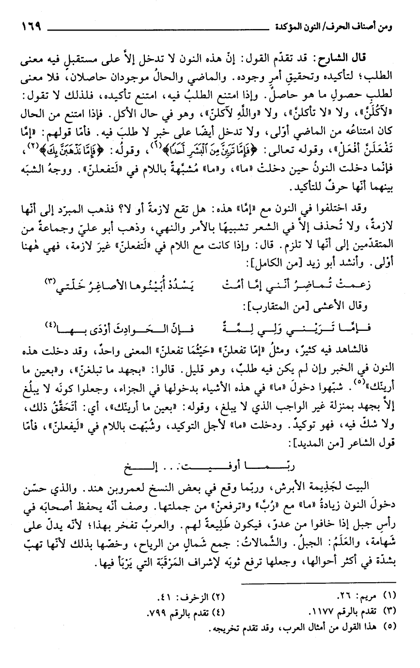 قال الشارح: قد تقدّم القول: إنّ هذه النون لا تدخل إلَّا على مستقبلٍ فيه معنى الطلب؛ لتأكيده وتحقيقِ أمر وجوده. والماضي والحالُ موجودان حاصلان، فلا معنى لطلب حصولِ ما هو حاصلٌ. وإذا امتنع الطلبُ فيه، امتنع تأكيده، فلذلك لا تقول: "لآكُلَنَ"، ولا "لا تأكلنَّ"، ولا "واللهِ لآكلنّ"، وهو في حال الأكل. فهذا امتنع من الحال كان امتناعُه من الماضي أوّلى، ولا تدخل أيضًا على خبر لا طلبَ فيه. فأمّا قولهم. "إمَّا تَفعَلَنَّ أفعَل"، وقوله تعالى: {فَإِمَّا تَرَيِنَّ مِنَ الْبَشَرِ أَحَدًا} (¬1)، وقوله: {فَإِمَّا نَذْهَبَنَّ بِكَ} (¬2)، فإنّما دخلت النونُ حين دخلت "ما"، و"ما" مُشبَّهةٌ باللام في "لَتفعلنّ". ووجهُ الشبَه بينهما أنّها حرفٌ للتأكيد.