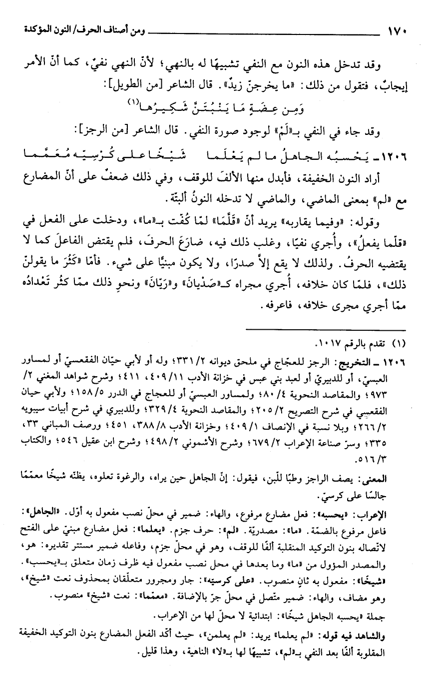 والشاهد فيه قوله: "لم يعلما" يريد: "لم يعلمن"، حيث أكّد الفعل المضارع بنون التوكيد الخفيفة المقلوبة ألفًا بعد النفي بـ "لم"، تشبيهًا لها بـ "لا" الناهية، وهذا قليل.