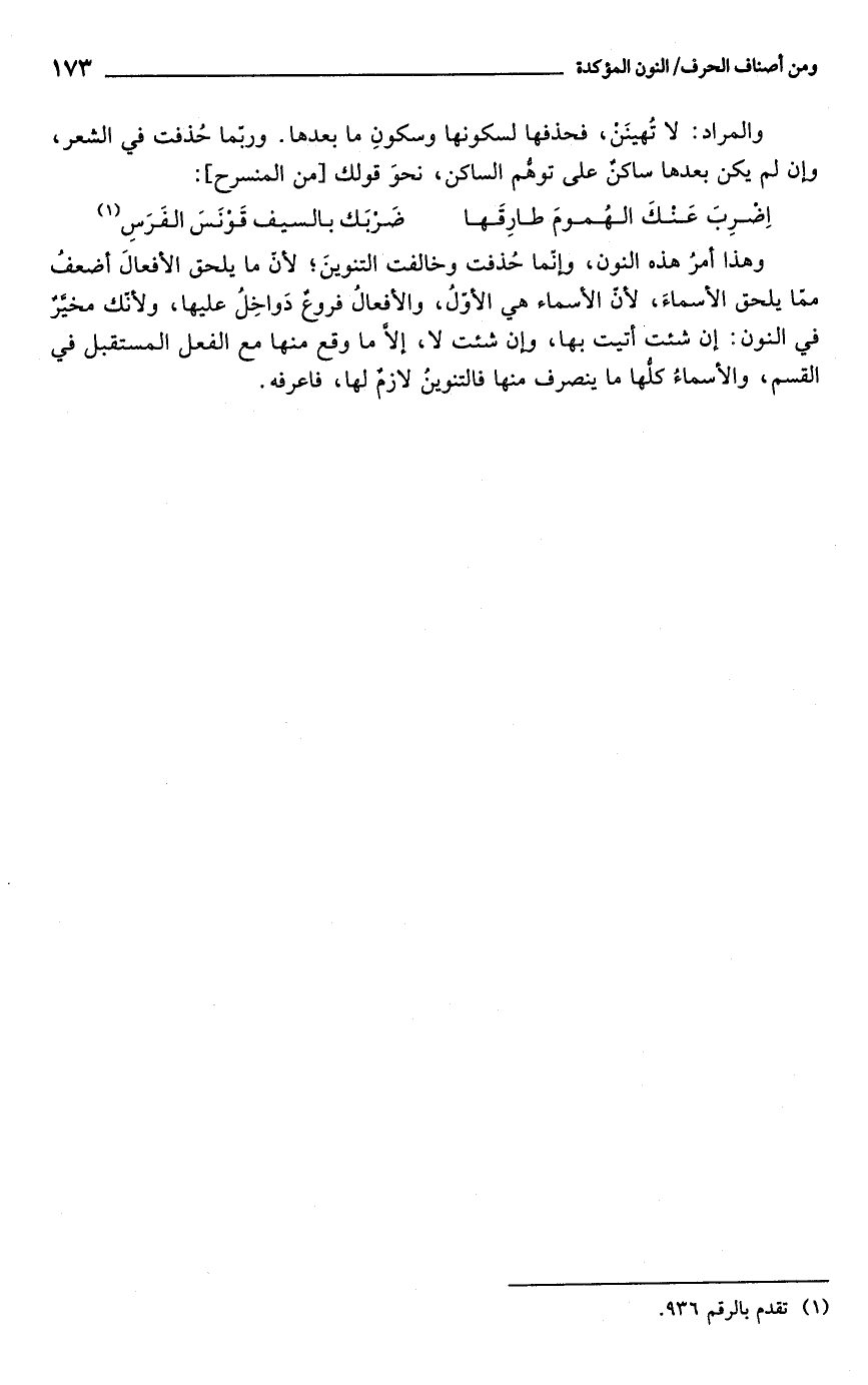 وهذا أمرُ هذه النون، وإنّما حُذفت وخالفت التنوينَ؛ لأنّ ما يلحق الأفعالَ أضعفُ ممّا يلحق الأسماءَ, لأنّ الأسماء هي الأوّلُ، والأفعالُ فروعٌ دَواخِلُ عليها, ولأنّك مخيَّرٌ في النون: إن شئت أتيت بها، وإن شئت لا، إلَّا ما وقع منها مع الفعل المستقبل في القسم، والأسماءُ كلُّها ما ينصرف منها فالتنوينُ لازمٌ لها، فاعرفه.