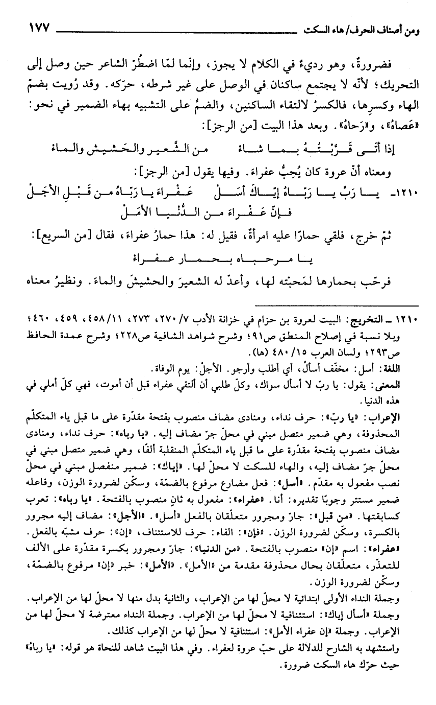 واستشهد به الشارح للدلالة على حبّ عروة لعفراء. وفي هذا البيت شاهد للنحاة هو قوله: "يا رباهُ" حيث حرّك هاء السكت ضرورة.