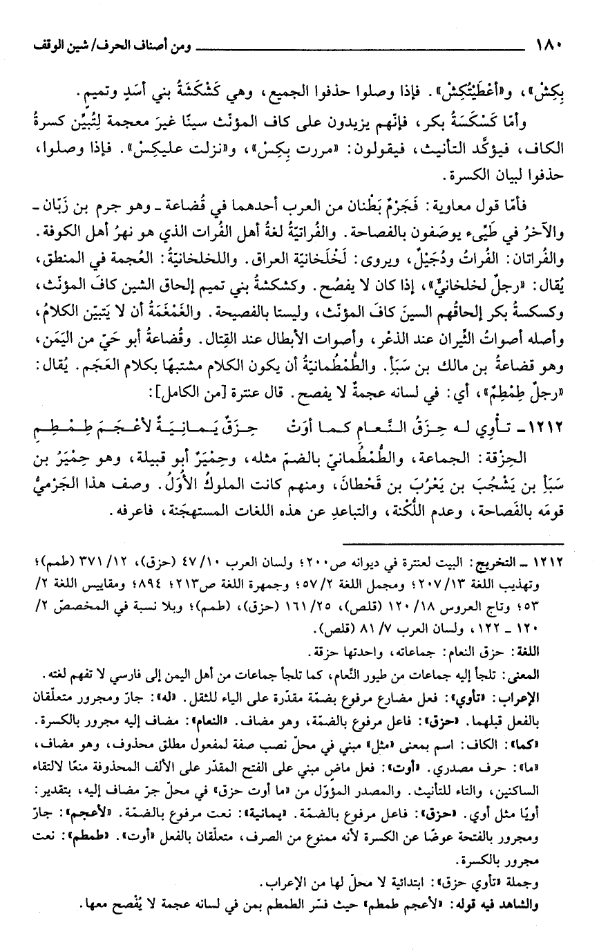فأمّا قول معاوية: فَجَرمٌ بَطنان من العرب أحدهما في قُضاعة -وهو جرم بن زَبّان- والآخرُ في طَيِّىء يوصَفون بالفصاحة. والفُراتيّةُ لغةُ أهل الفُرات الذي هو نهرُ أهل الكوفة. والفُراتان: الفُراتُ ودُجَيلٌ، ويروى: لَخلَخانيّة العراق. واللخلخانيّةُ: العُجمة في المنطق، يُقال: "رجل لخلخانيٌّ"، إذا كان لا يفصُح. وكشكشةُ بني تميم إلحاق الشين كافَ المؤنّث، وكسكسةُ بكر إلحاقُهم السينَ كافَ المؤنّث، وليستا بالفصيحة. والغمغَمَةُ أن لا يَتبيّن الكلامُ، وأصله أصواتُ الثِّيران عند الذعْر، وأصوات الأبطال عند القِتال. وقُضاعةُ أبو حَيّ من اليَمَن، وهو قضاعةُ بن مالك بن سَبَأ. والطُّمطُمانيّةُ أن يكون الكلام مشتبهًا بكلام العَجَم. يقال: "رجلٌ طِمطِمٌ"، أي: في لسانه عجمةٌ لا يفصح. قال عنترة [من الكامل]: