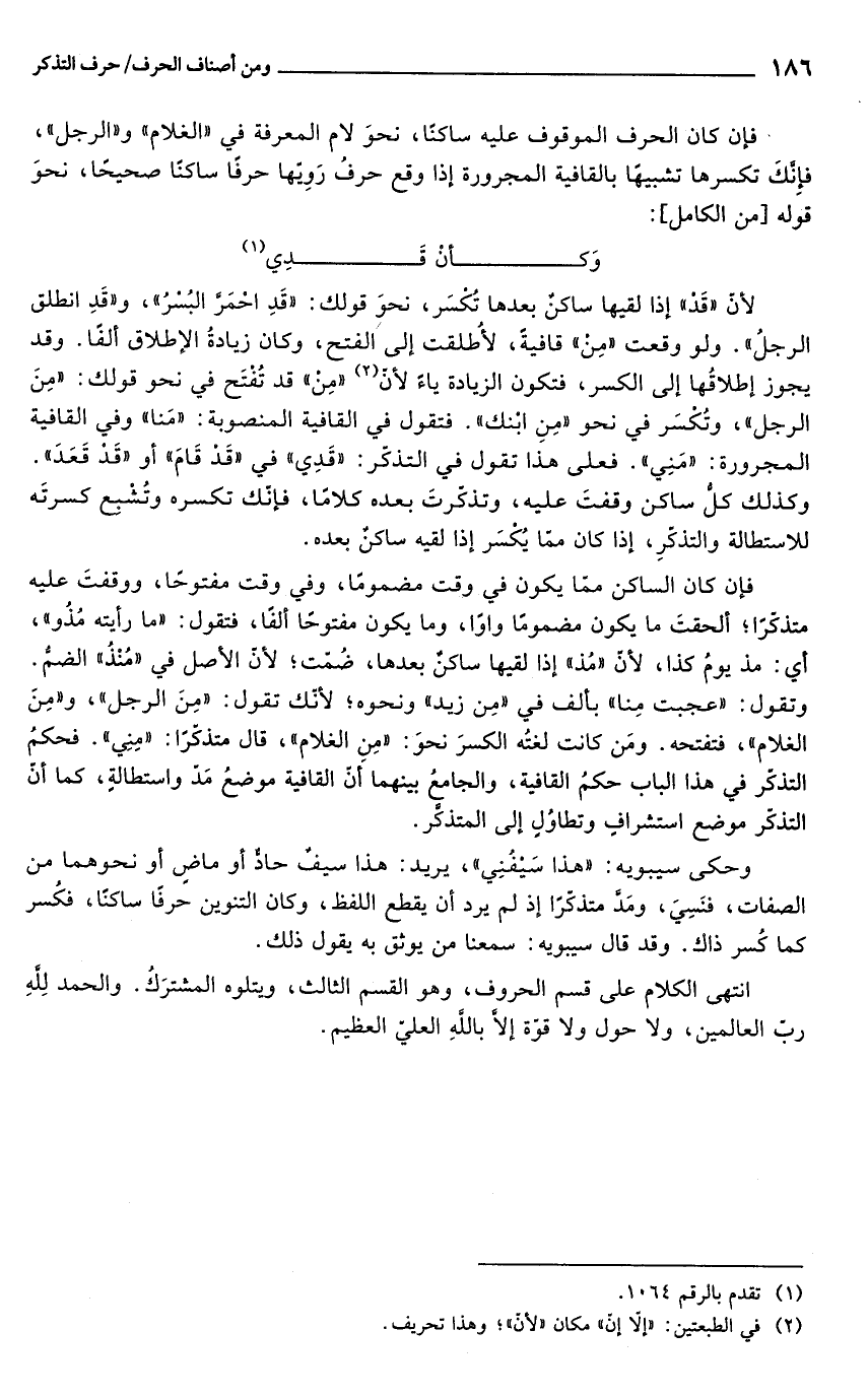 لأنّ "قَدْ" إذا لقيها ساكنٌ بعدها تُكسَر، نحوَ قولك: "قَدِ احْمَرَّ البُسرُ"، و"قَدِ انطلق الرجلُ". ولو وقعت "من" قافيةً، لأُطلقت إلىَ الفتح، وكان زيادةُ الإطلاق ألفًا. وقد يجوز إطلاقُها إلى الكسر، فتكون الزيادة ياءً لأنّ (¬2) "من" قد تُفْتَح في نحو قولك: "مِنَ الرجل"، وتُكسَر في نحو "مِنِ ابنك". فتقول في القافية المنصوبة: "مَنا" وفي القافية المجرورة:"مَنِي". فعلى هذا تقول في التذكّر: "قَدِى" في "قَدْ قَامَ" أو "قَدْ قَعَدَ". وكذلك كلُّ ساكن وقفتَ عليه، وتذكرتَ بعده كلامًا، فإنّك تكسره وتُشْبع كسرتَه للاستطالة والتذكّرِ، إذا كان ممّا يُكسَر إذا لقيه ساكنٌ بعده.