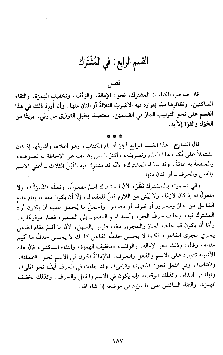 قال الشارح: هذا القسم الرابع آخِرُ أقسام الكتاب، وهو أعلاها وأشرفُها إذ كان مشتملًا على نُكت هذا العلم وتصريفه، وأكثرُ الناس يضعف عن الإحاطة به لغموضه، والمنفعةُ به عامّةٌ. وقد سمّاه المشترك؛ لأنّه قد يشترِك فيه القُبُلُ الثلاث -أعني الاسم والفعل والحرف- أو اثنان منها.