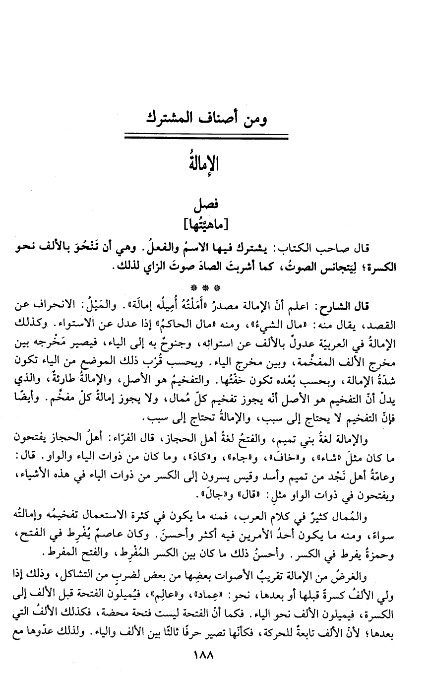 قال الشارح: اعلم أنّ الإمالة مصدرُ "أَمَلتُهُ أمِيلُه إمالَة". والمَيلُ: الانحراف عن القصد، يقال منه: "مال الشيءُ"، ومنه "مال الحاكمُ" إذا عدل عن الاستواء. وكذلك الإمالةُ في العربية عدولٌ بالألف عن استوائه، وجنوحٌ به إلى الياء، فيصير مخرجه بين مخرج الألف المفخَّمة، وبين مخرج الياء. وبحسب قُرْب ذلك الموضع من الياء تكون شدّةُ الإمالة، وبحسب بُعده تكون خفّتُها. والتفخيمُ هو الأصل، والإمالةُ طارئةٌ، والذي يدلّ أنّ التفخيم هو الأصل أنّه يجوز تفخيم كل مُمال، ولا يجوز إمالةُ كل مفخَّم. وأيضًا فإنّ التفخيم لا يحتاج إلى سبب، والإمالةُ تحتاج إلى سبب.