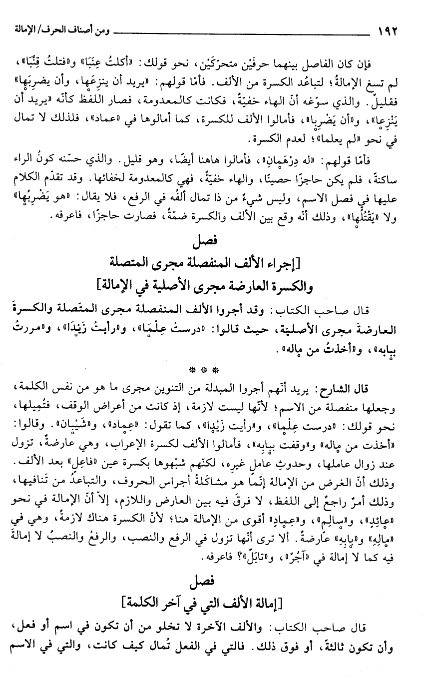 قال الشارح: يريد أنّهم أجروا المبدلة من التنوين مجرى ما هو من نفس الكلمة، وجعلها منفصلة من الاسم؛ لأنّها ليست لازمة، إذ كانت من أعراض الوقف، فتُمِيلها، نحو قولك: "درست عِلْما"، و"رأيت زَيدا"، كما تقول: "عِماد"، و"شَيْبان". وقالوا: "أخذت من ماله" و"وقفت ببابِه"، فأمالوا الألف لكسرة الإعراب، وهي عارضةٌ، تزول عند زوال عاملها، وحدوثِ عاملِ غيرِه، لكنّهم شبّهوها بكسرة عين "فاعِلِ" بعد الألف. وذلك أنّ الغرض من الإمالة إنّما هو مشاكَلةُ أجراس الحروف، والتباعدُ من تَنافيها، وذلك أمرٌ راجعٌ إلى اللفظ، لا فرقَ فيه بين العارض واللازم، إلَّا أنّ الإمالة في نحو "عائِدٍ"، و"سالِمٍ"، و"عِمادٍ" أقوى من الإمالة هنا؛ لأنّ الكسرة هناك لازمةٌ، وهي في "مالِهِ" و"بابِهِ" عارضةٌ. ألا ترى أنّها تزول في الرفع والنصب، والرفعُ والنصبُ لا إمالةَ فيه كما لاْ إمالة في "آجُرٌ"، و"تابَلٌ"؟ فاعرفه.
