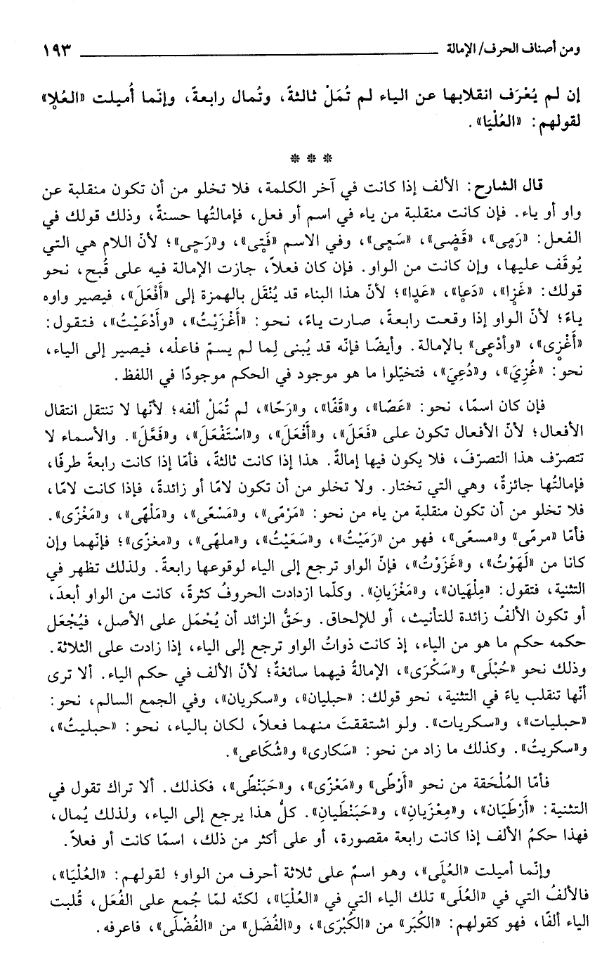 قال الشارح: الألف إذا كانت في آخر الكلمة، فلا تخلو من أن تكون منقلبة عن واو أو ياء. فإن كانت منقلبة من ياء في اسم أو فعل، فإمالتُها حسنةٌ، وذلك قولك في الفعل: "رَمى"، "قَصى"، "سَعى"، وفي الاسم "فَتى"، و"رَجى"؛ لأنّ اللام هي التي يُوقَف عليها، وإن كانت من الواو. فإن كان فعلًا، جازت الإمالة فيه على قُبح، نحو قولك: "غَزا"، "دَعا"، "عَدا"؛ لأنّ هذا البناء قد يُنْقل بالهمزة إلى "أَفْعَلَ"، فيصير واوه ياءً؛ لأنّ الواو إذا وقعت رابعةً، صارت ياءً، نحو: "أَغْزَيْتُ"، "وأَدْعَيْتُ"، فتقول: "أَغْزى"، "وأدْعى" بالإمالة. وأيضًا فإنّه قد يُبنى لِما لم يسمّ فاعلْه، فيصير إلى الياء، نحو: "غُزِىَ"، و"دُعِيَ"، فتخيّلوا ما هو موجود في الحكم موجودًا في اللفظ.